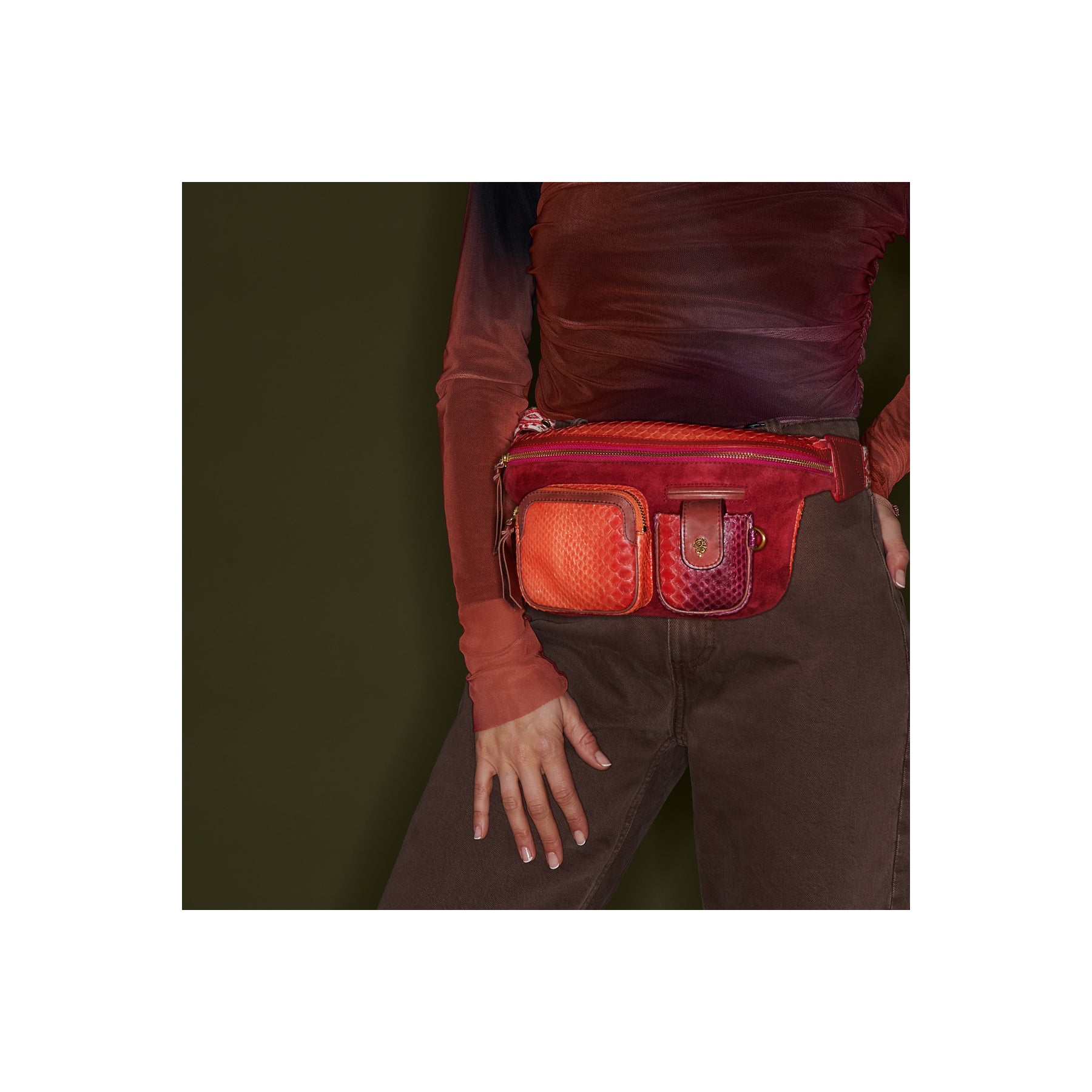 Ce sac-ceinture en python et cuir suédé a été pensé pour se porter aussi bien à la taille qu’en cross body afin de pouvoir changer d’allure au gré de vos envies.