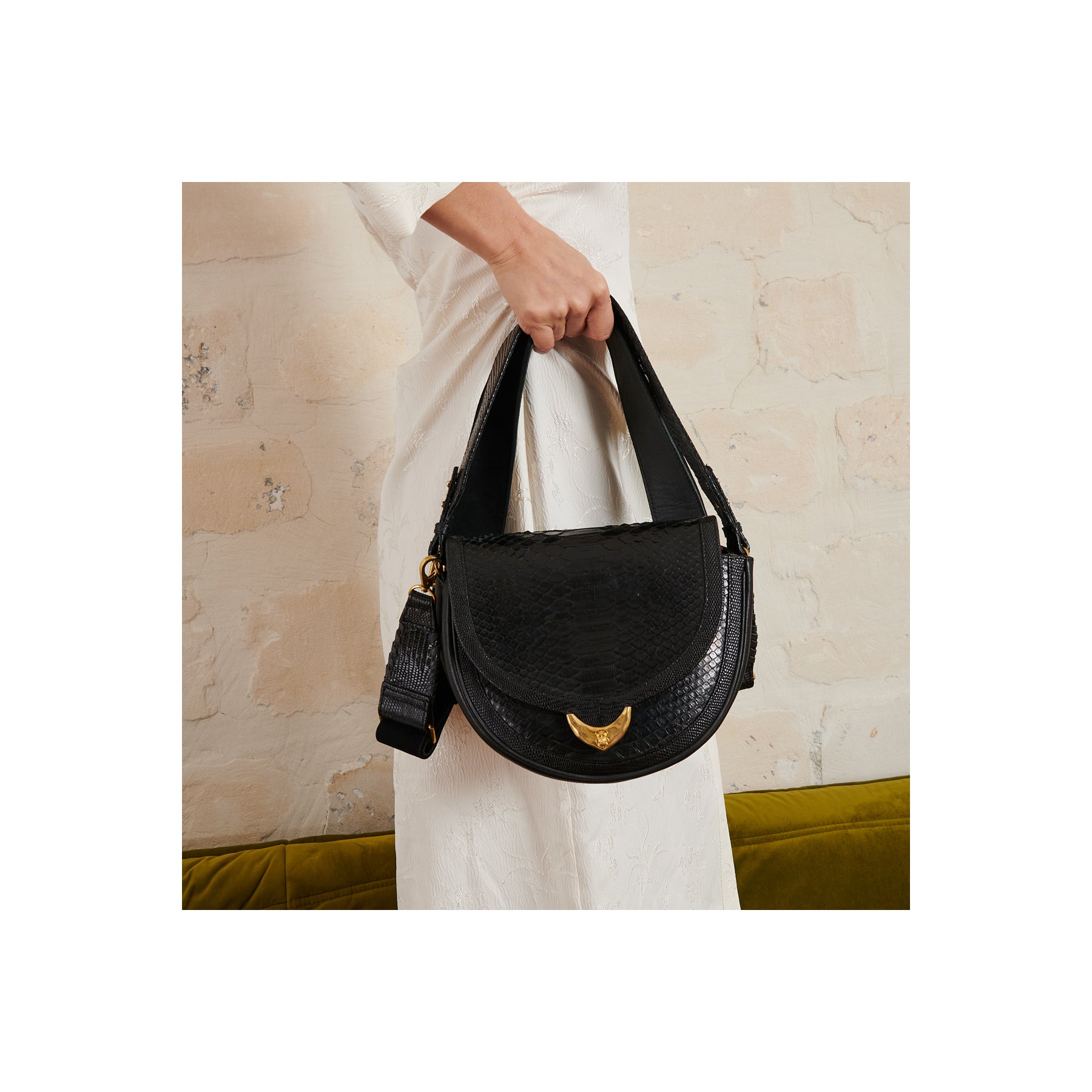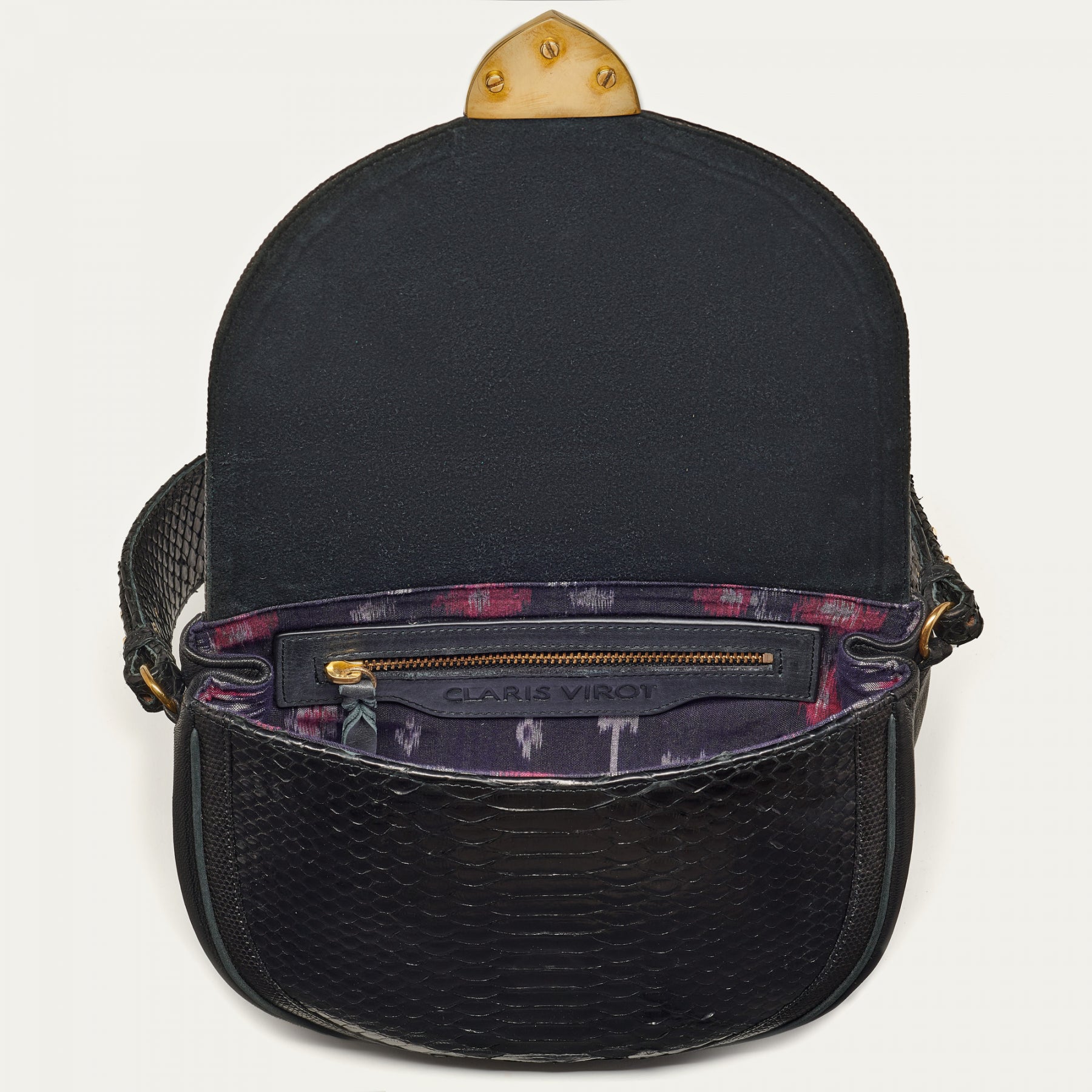 Notre nouveau sac besace bi-matière Big Victoria est composé de python et cuir suédé. Victoria se ferme à l’aide d'un fermoir à embout métallique finement martelé et orné d’un petit scarabée. Plus grand que le Victoria mais également organisé en un seul compartiment avec une poche interne zippée, le Big Victoria pourra transporter tous vos effets personnels.