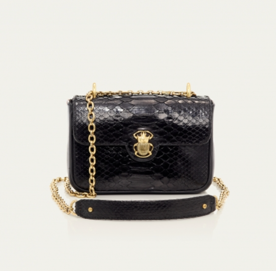 Ce petit sac pourra vous accompagner dans toutes vos sorties. Doté d'une chaîne qui peut se porter simple ou double en fonction de vos envies, il est aussi orné d’un petit scarabée porte bonheur doré qui lui donne un look chic et rock.