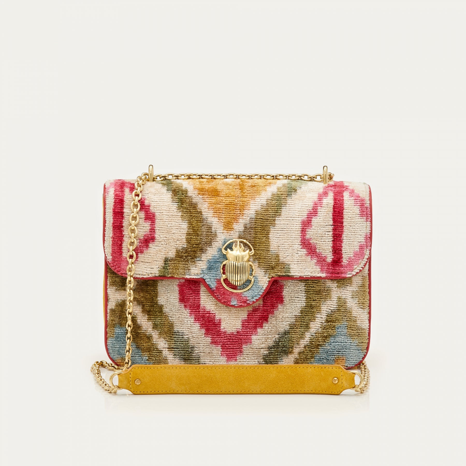 Ce sac porté épaule en cuir suédé et tissus velours est muni d'une chaîne artisanale, il est doté d'un fermoir bijoux, qui représente un scarabée doré. Sa taille est idéal pour tous les jours et il peut se porter de jour comme de nuit.