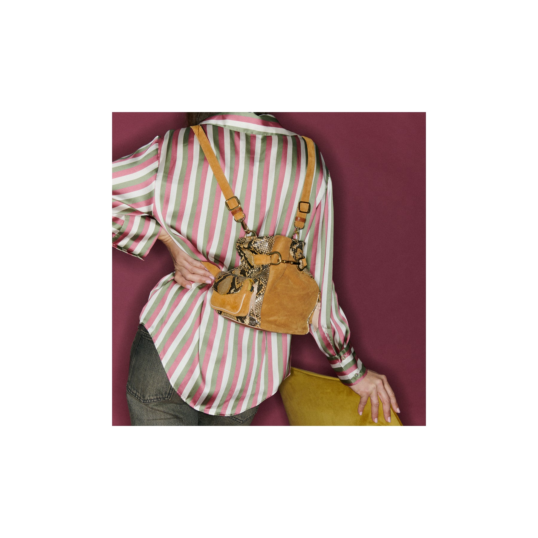 Le sac sceau Lola est le sac qui vous accompagnera partout. Composé de veau velours, de cuir et de python, notre modèle Lola peut se porter en sac à dos ou à l’épaule, grâce à son ingénieuse double bandoulière. Son compartiment principal se referme grâce à une double fermeture: un mousqueton doré et un bouton pression. Ses deux poches latérales sont parfaites pour accueillir clefs et cartes.