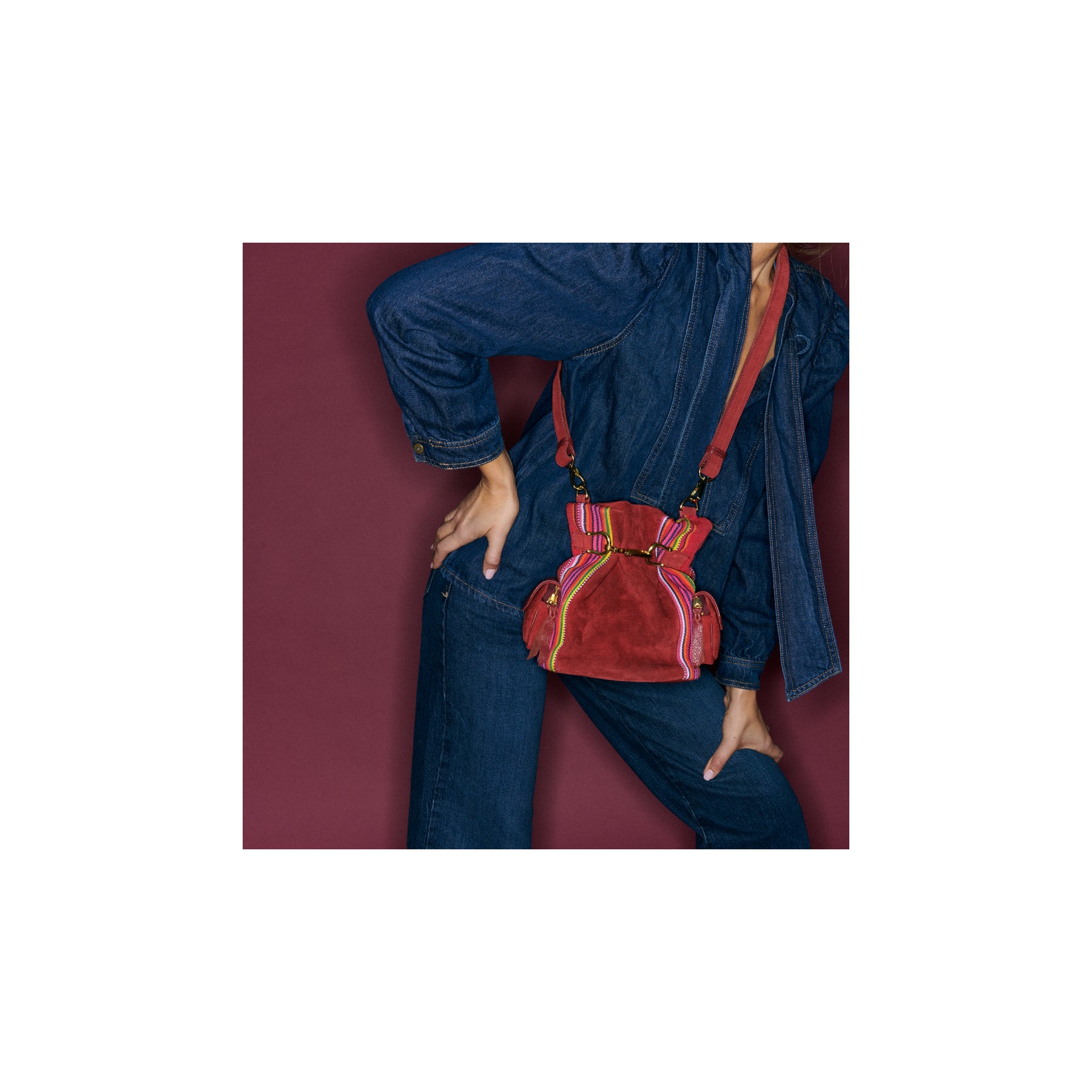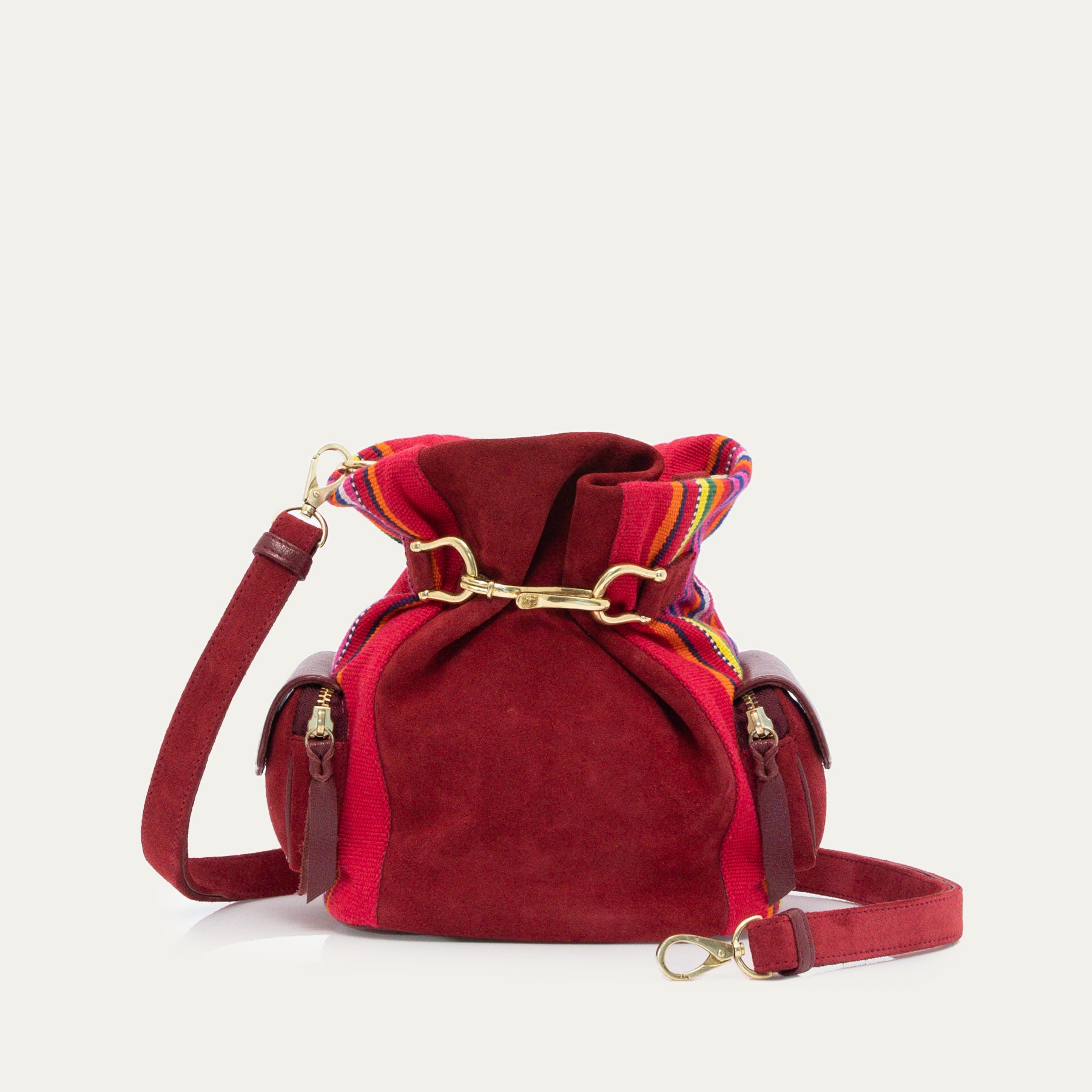 Le sac sceau Lola est le sac qui vous accompagnera partout. Composé de veau velours, de cuir et de tissus Timor tissé à la main, il peut se porter en sac à dos ou à l’épaule, grâce à son ingénieuse bandoulière. Son compartiment principal se referme grâce à une double fermeture: un mousqueton doré et un bouton pression. Ses deux poches latérales sont parfaites pour accueillir clefs et cartes.