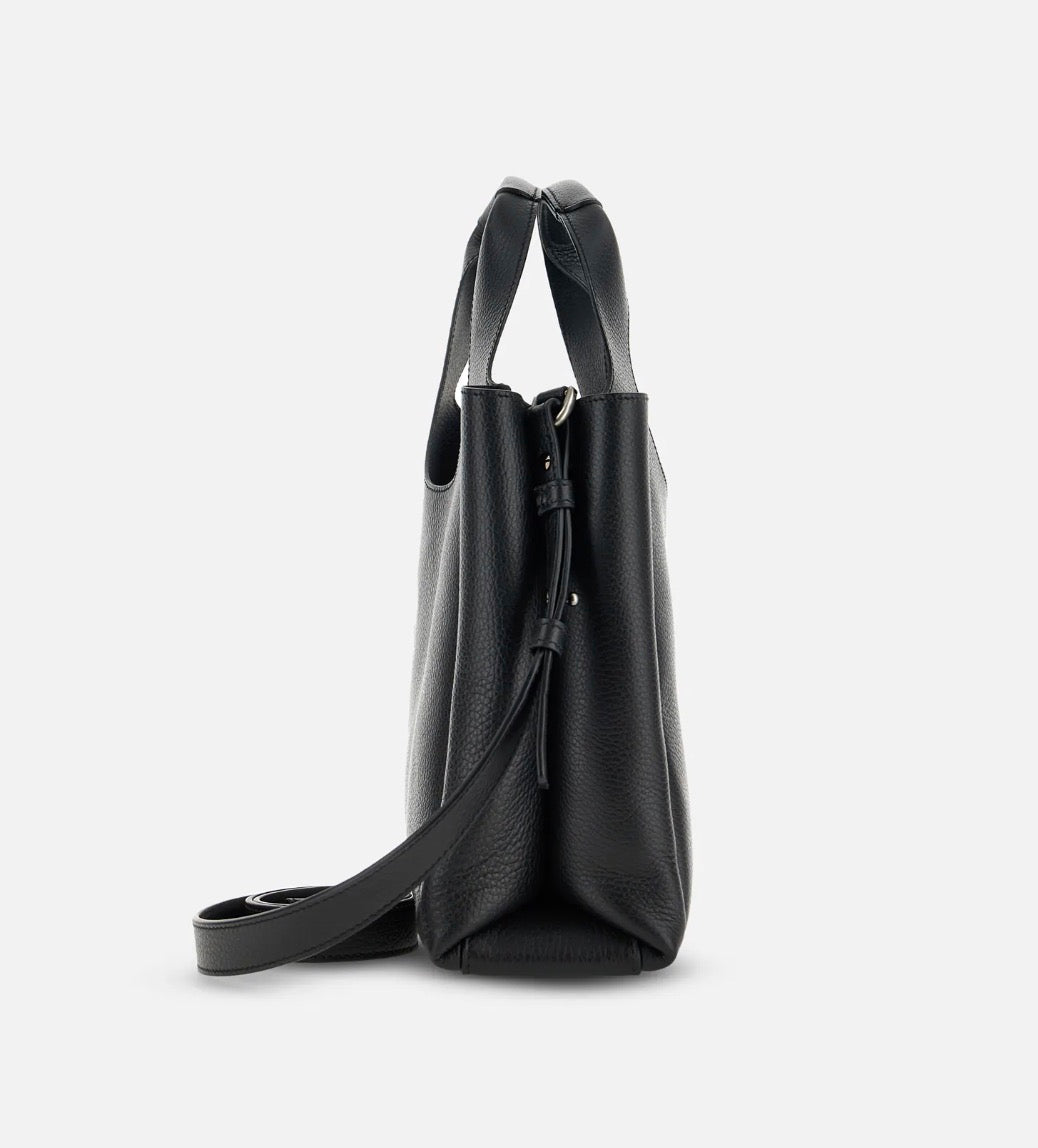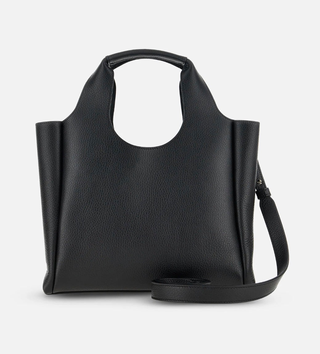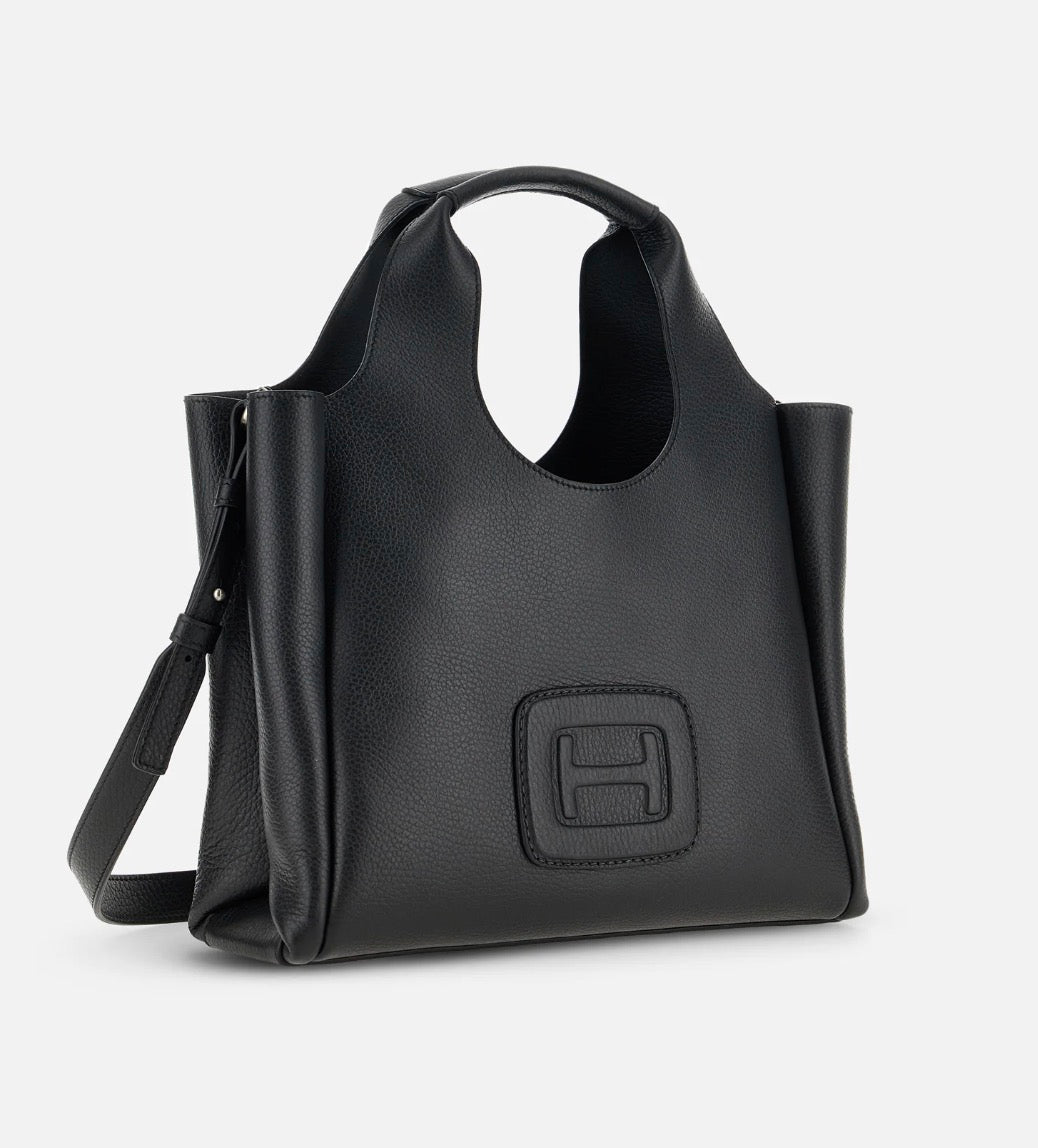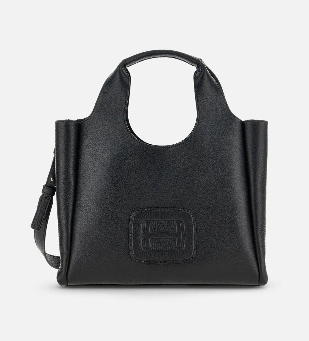 Cool et féminine, la collection Hogan H-Bag représente une synthèse contemporaine de fonctionnalité et d'élégance. Doté d'un maxi H embossé, ce sac shopping est confectionné en cuir martelé, avec deux poignées fixes et une bandoulière réglable et amovible. L'intérieur est divisé en deux compartiments séparés par une poche plate zippée, amovible et pouvant servir de pochette.