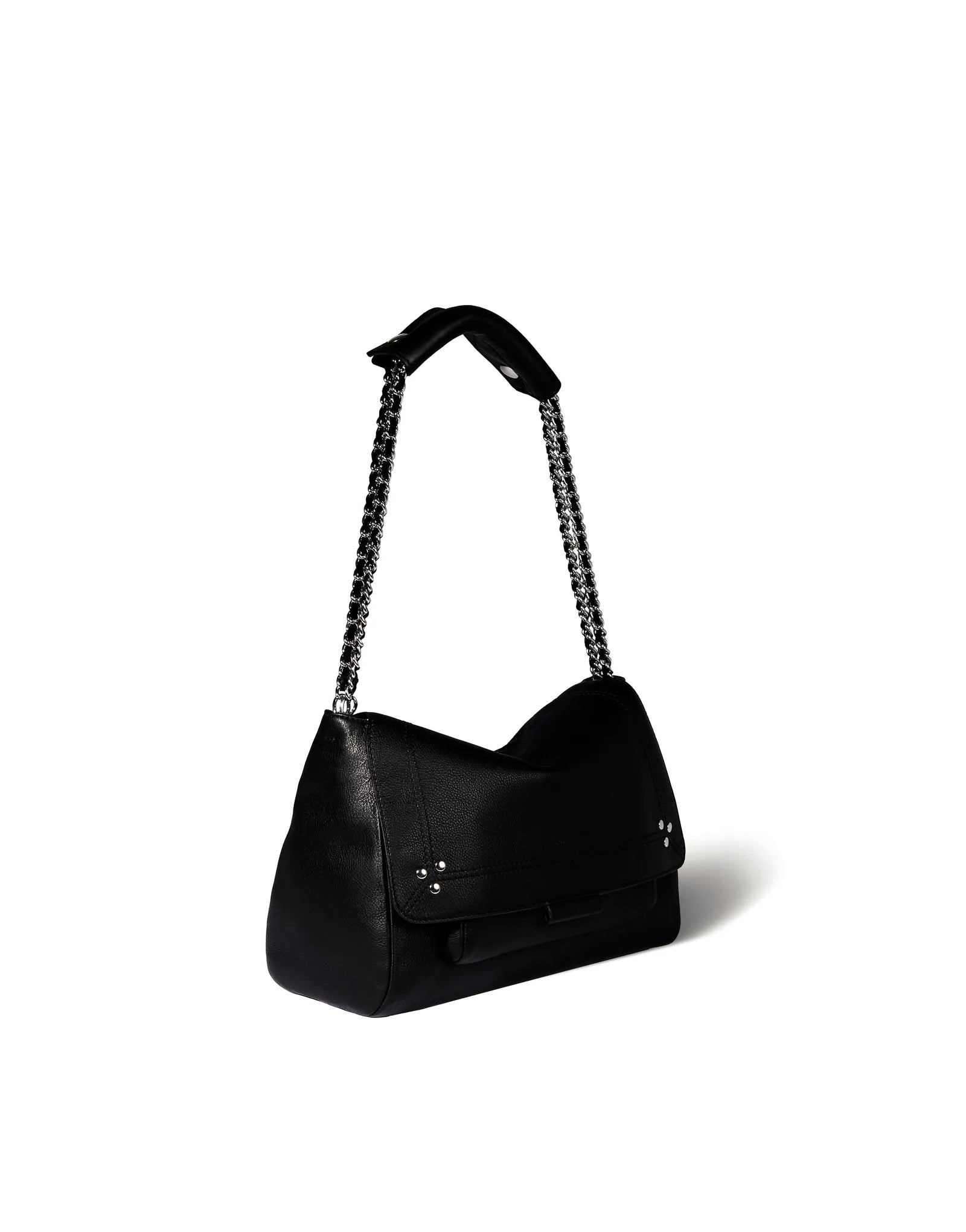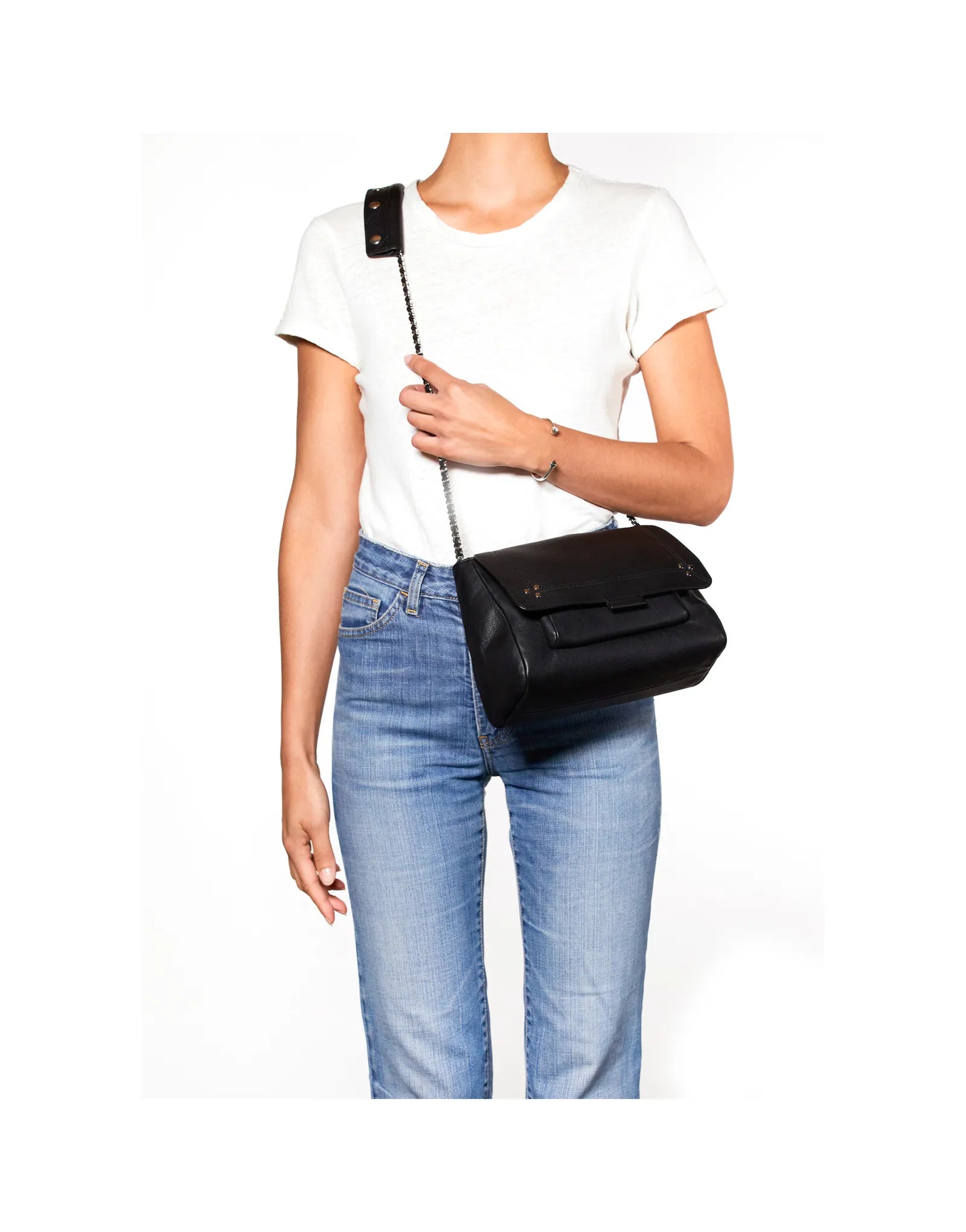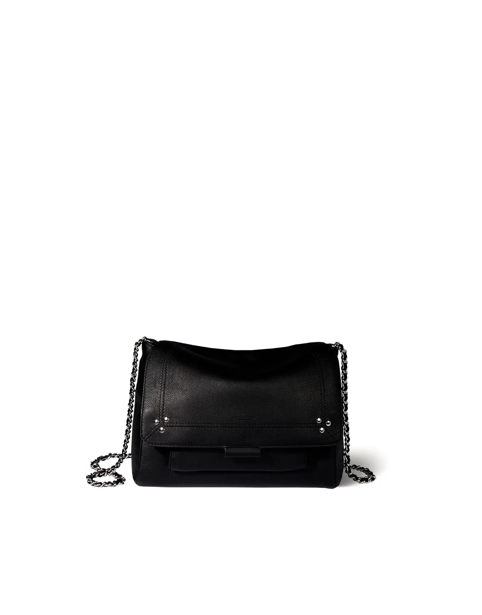 Sac besace, porté épaule ou croisé. Bandoulière chaîne et cuir, amovible et ajustable. Rabat avec fermeture aimantée.