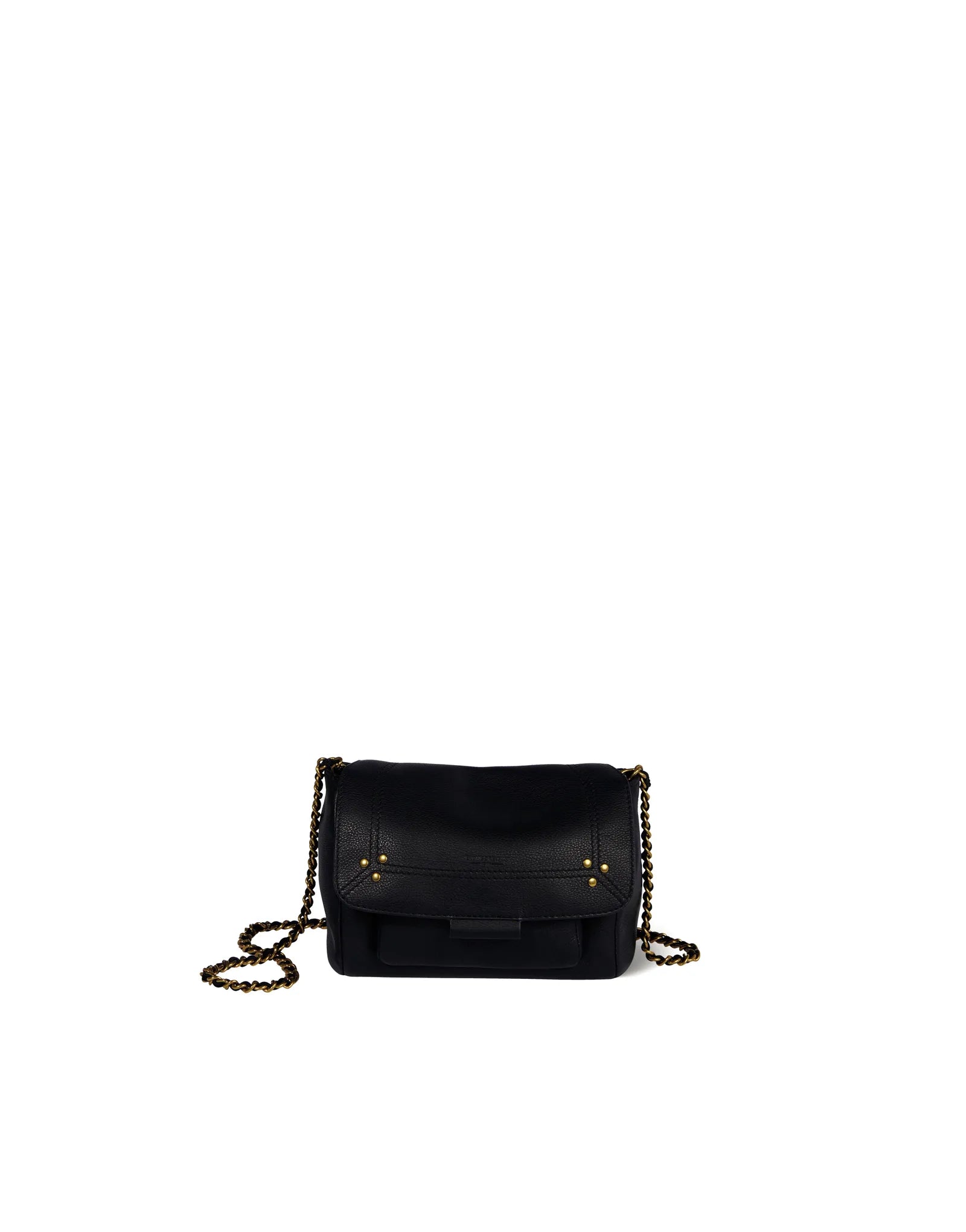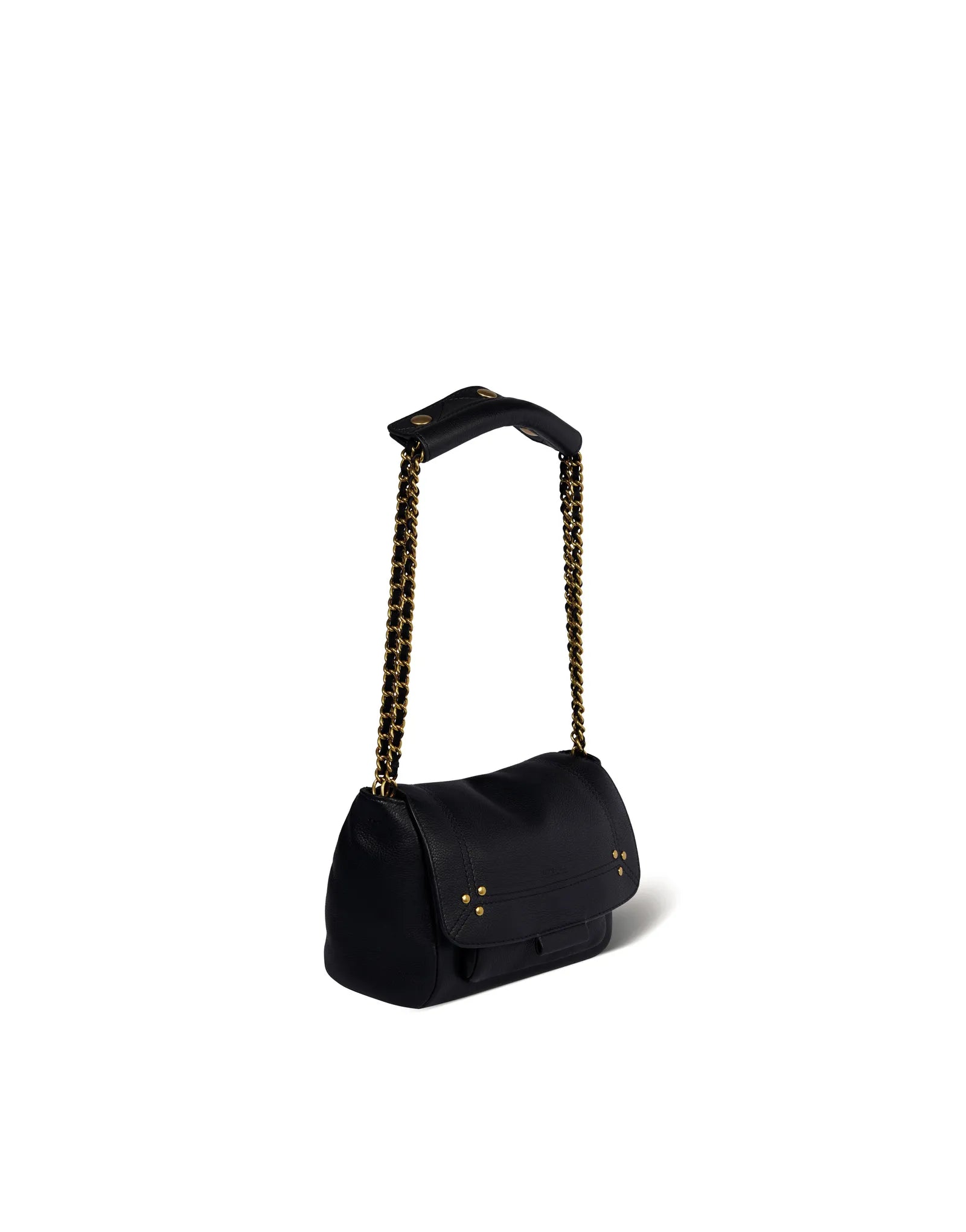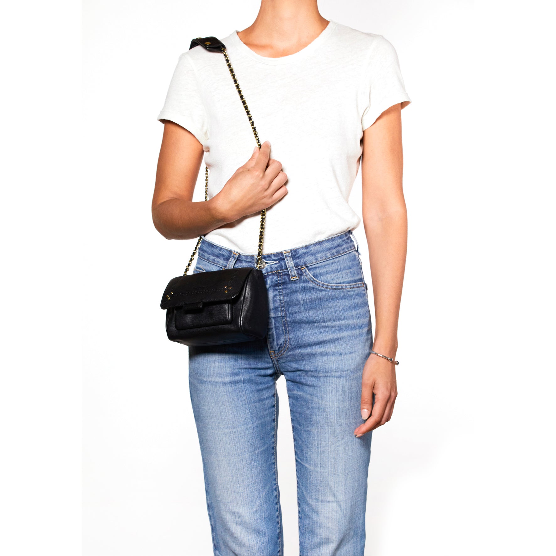 Mini sac en cuir, porté épaule ou croisé. Bandoulière chaîne et cuir, amovible et ajustable. Rabat avec fermeture aimantée.