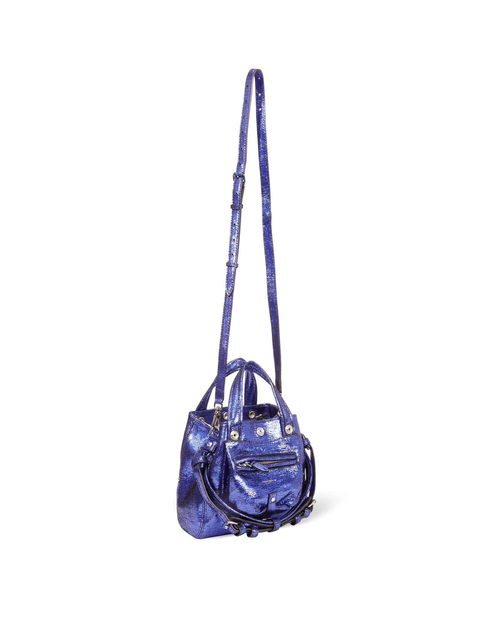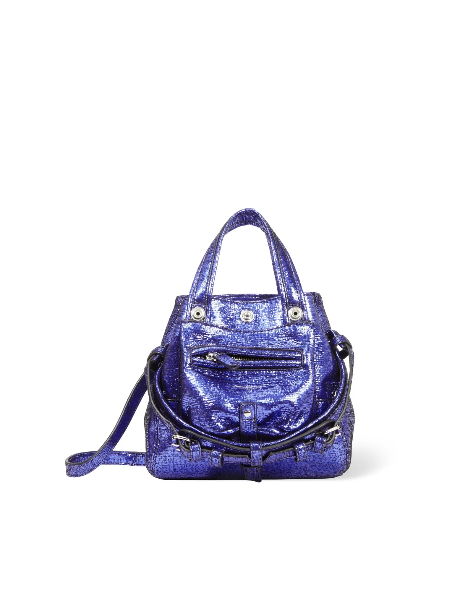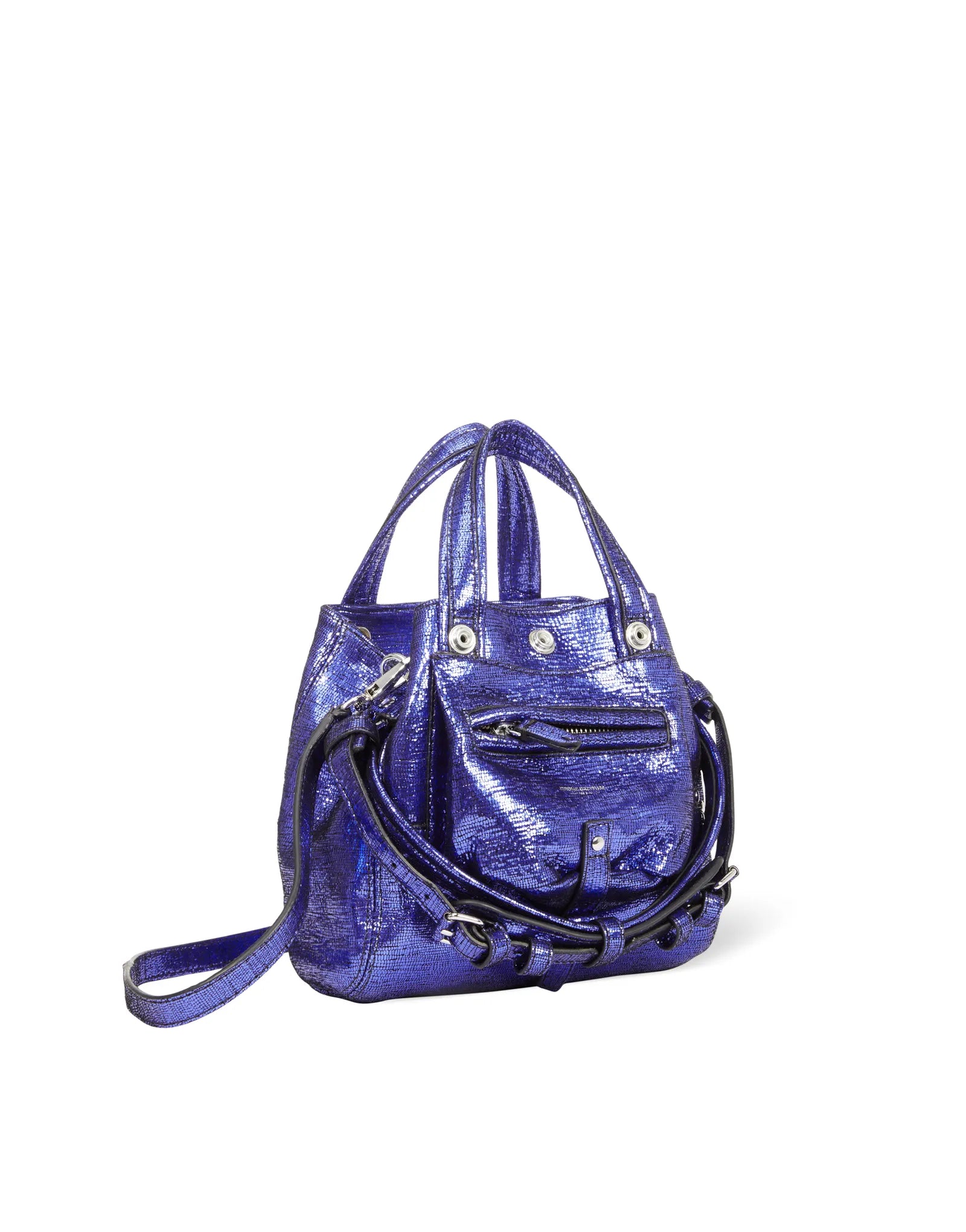 Mini-sac bandoulière, porté à la main. Deux poignées en cuir et une bandoulière en cuir amovible et ajustable. Fermeture par des boutons pressions.Chèvre Lamé Gitane