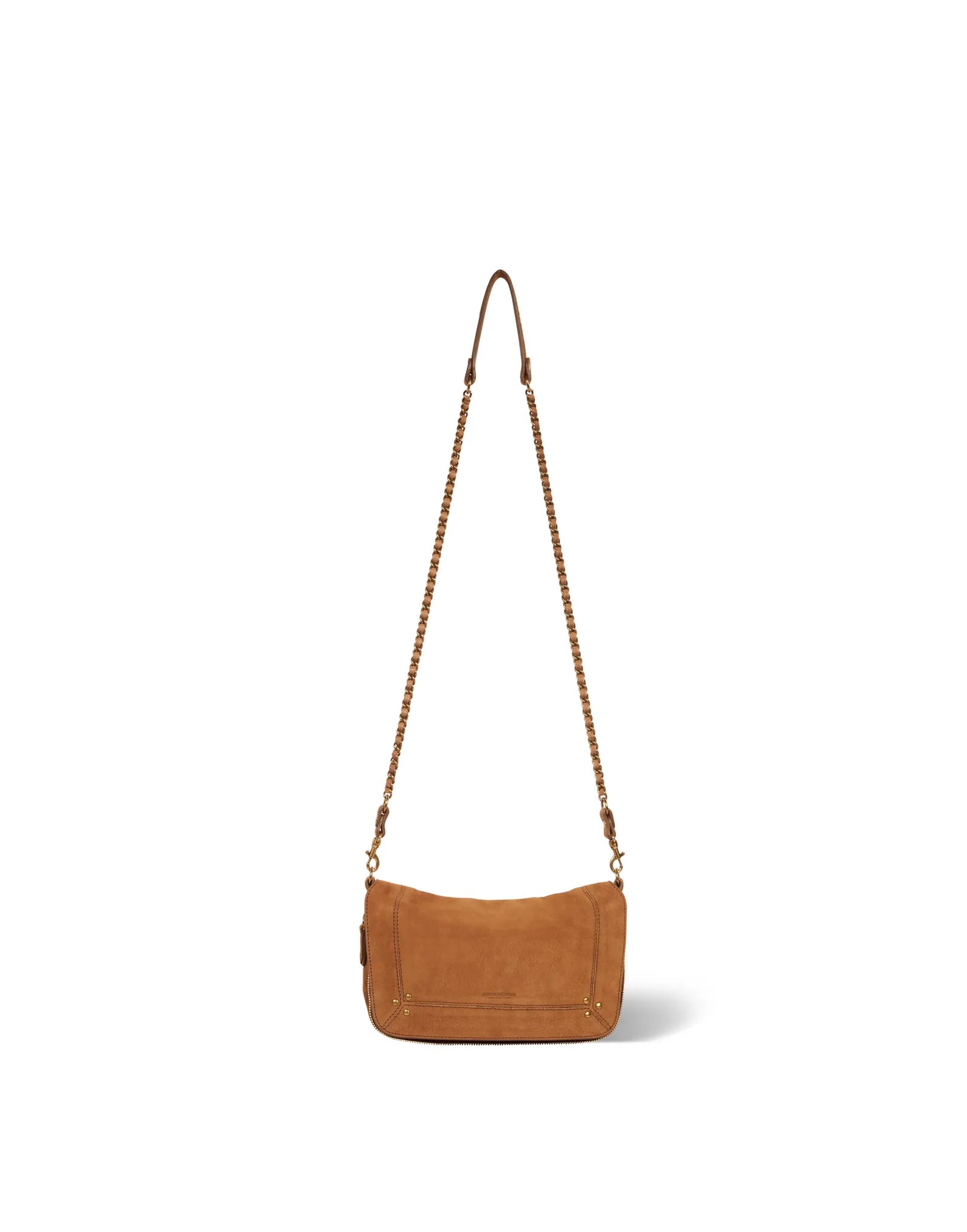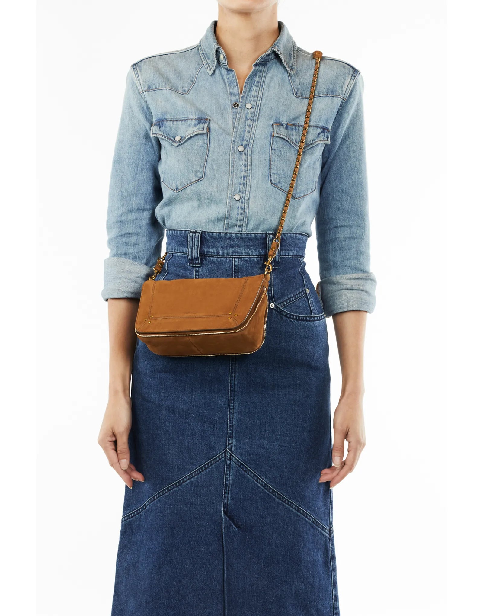 Une bandoulière amovible en chaîne tressée de cuir mesurant 105 cm. Fermeture par un rabat en cuir aimanté. Sac organisé en un grand compartiment. Un miroir et un lien porte-clés à l’intérieur du sac.