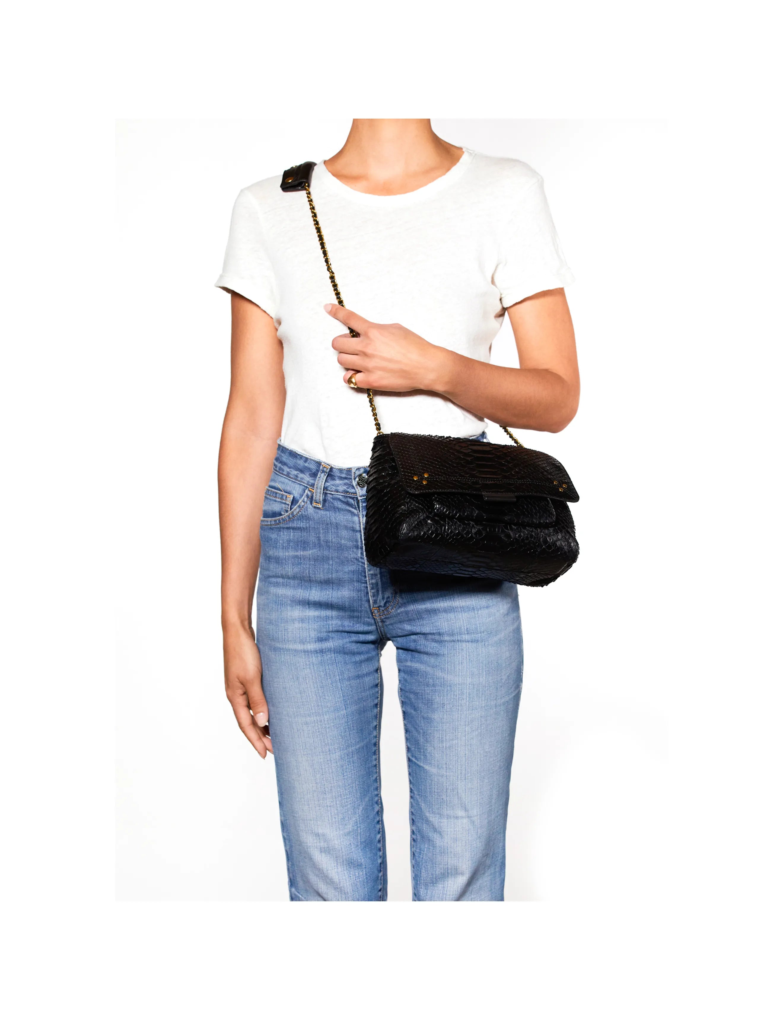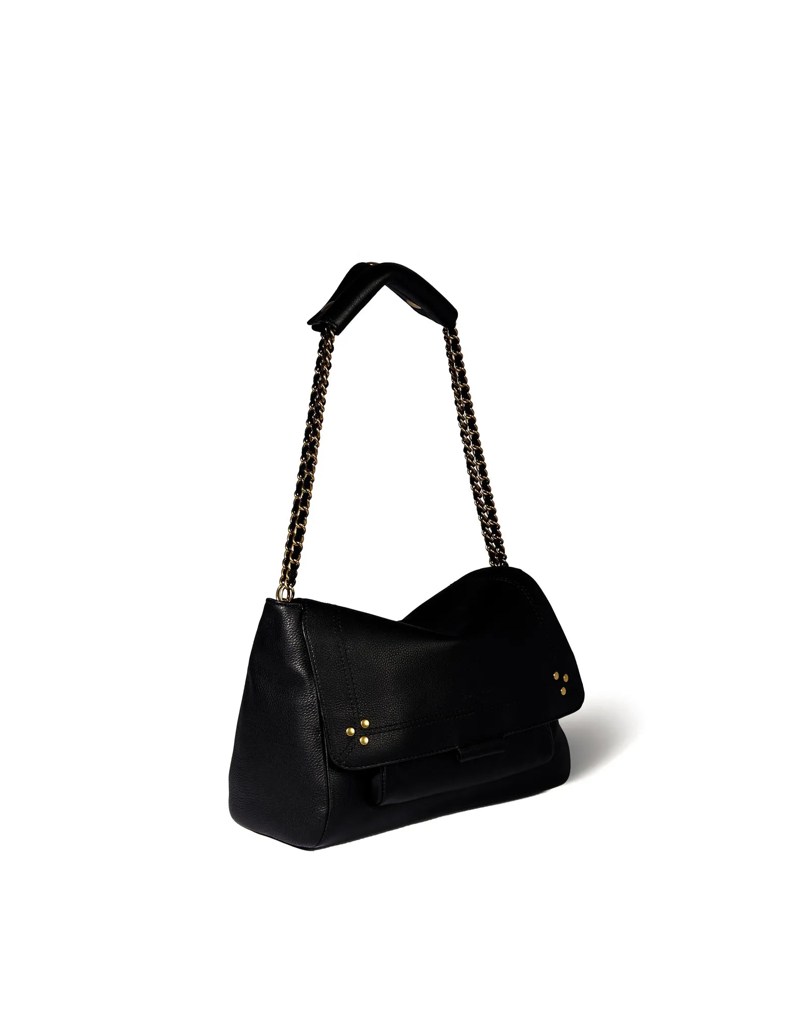 Sac besace, porté épaule ou croisé. Bandoulière chaîne et cuir, amovible et ajustable. Rabat avec fermeture aimantée.