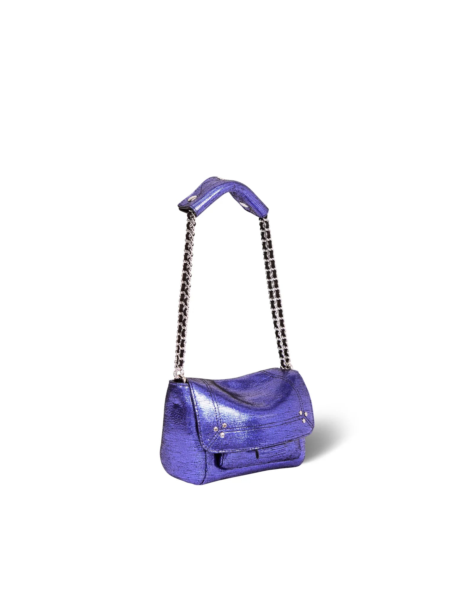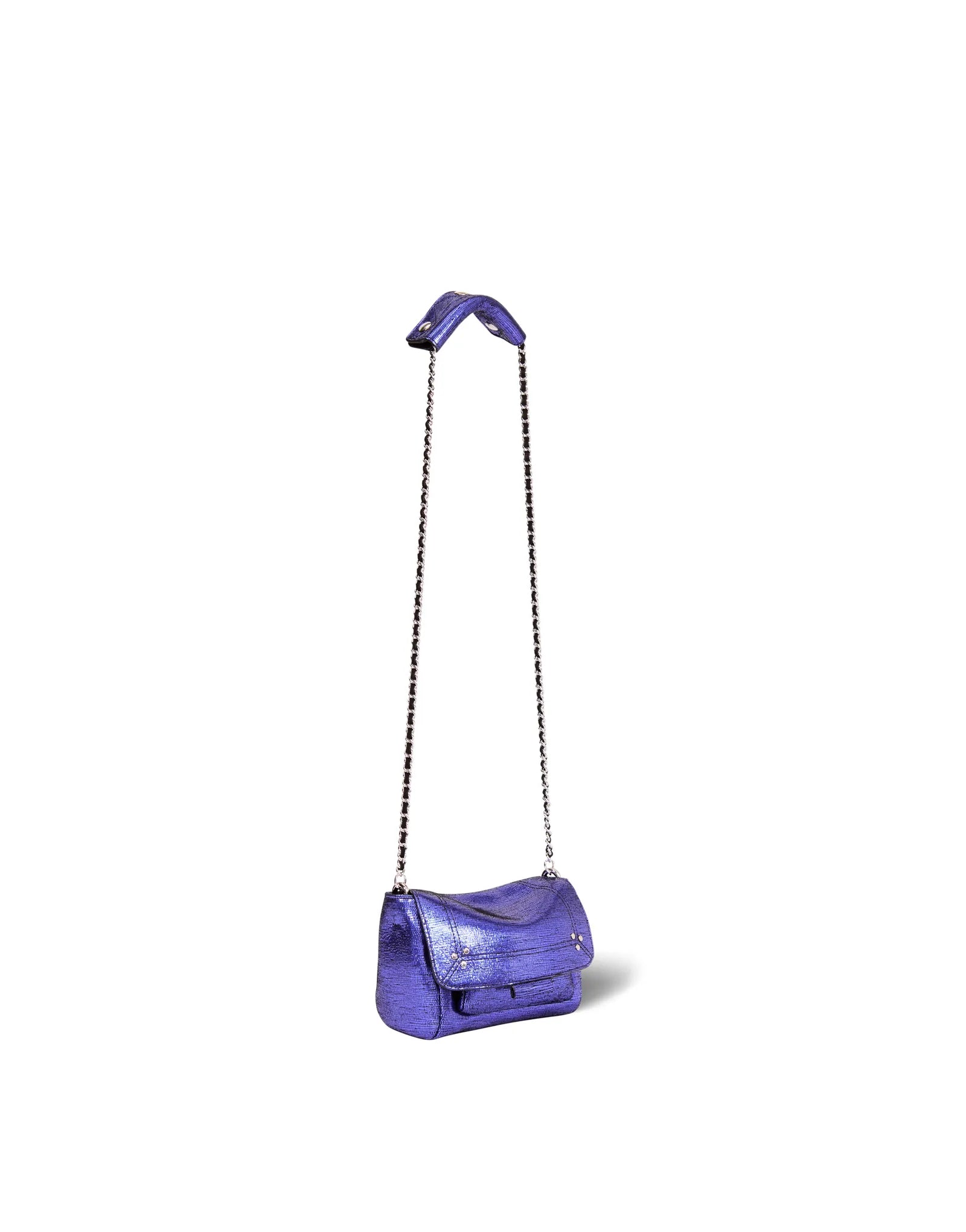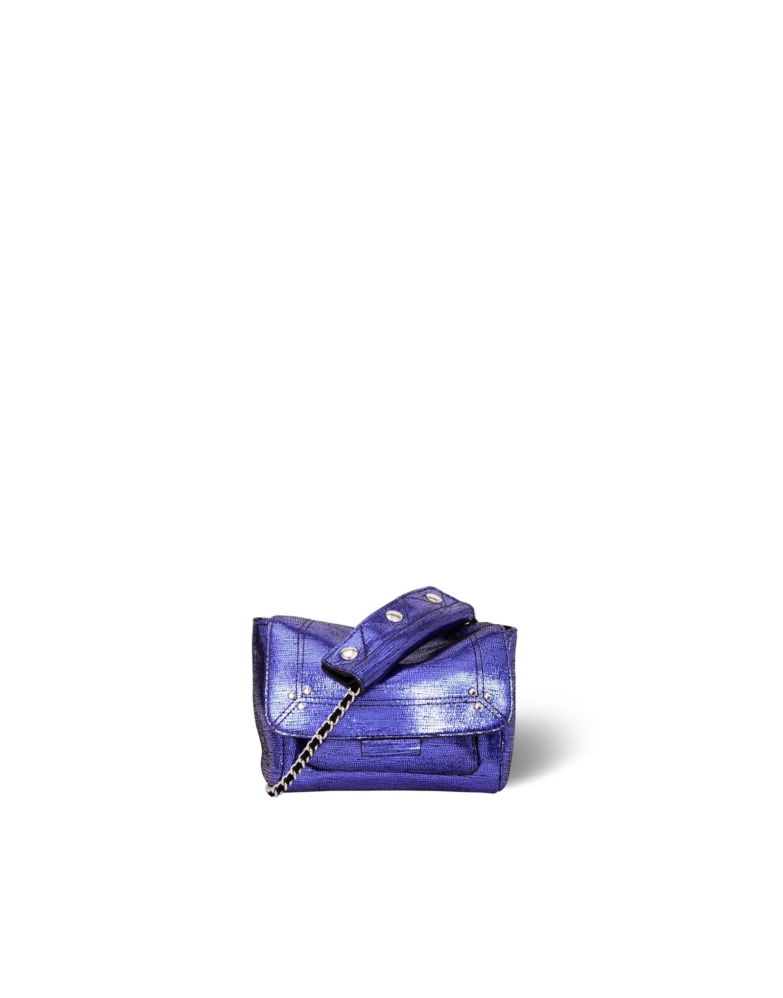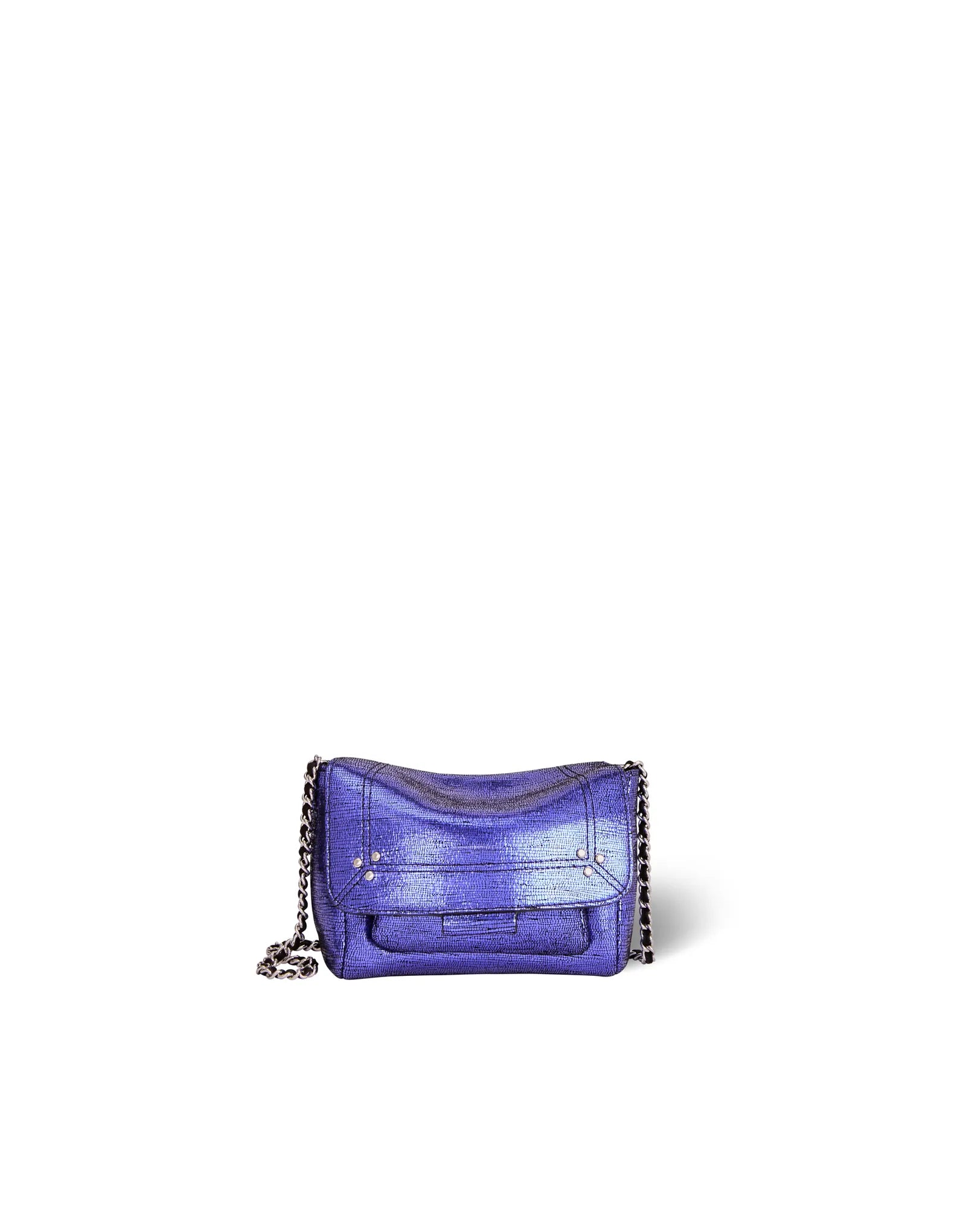 Mini sac en cuir, porté épaule ou croisé. Bandoulière chaîne et cuir, amovible et ajustable. Rabat avec fermeture aimantée.