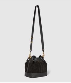 Sac seau en cuir suédé noir. Fermeture ajustable par bouton pression. Porté épaule ou croisé. Bandoulière en cuir amovible. Poche intérieure avec un lien porte-clés à l’intérieur du sac.