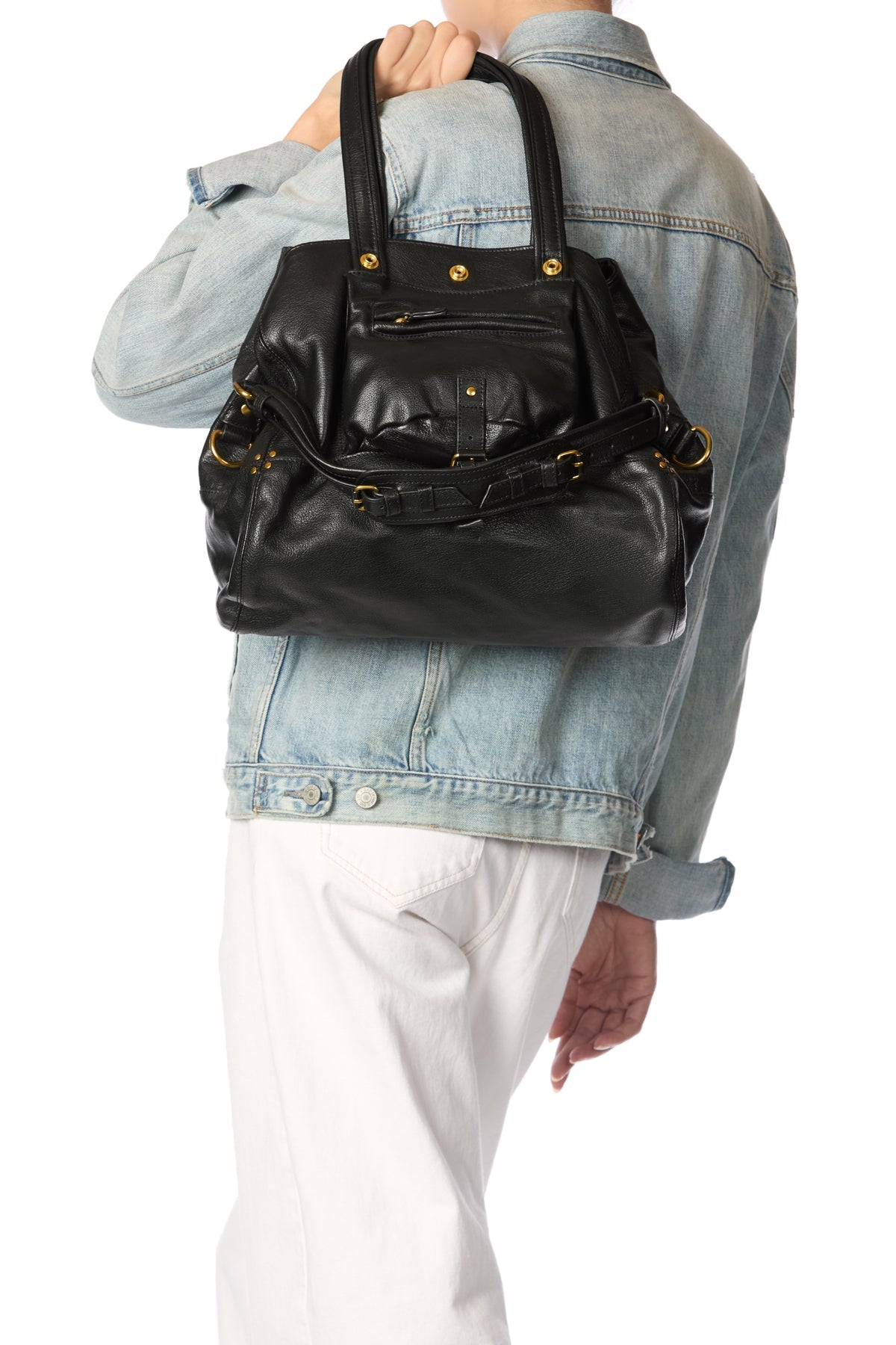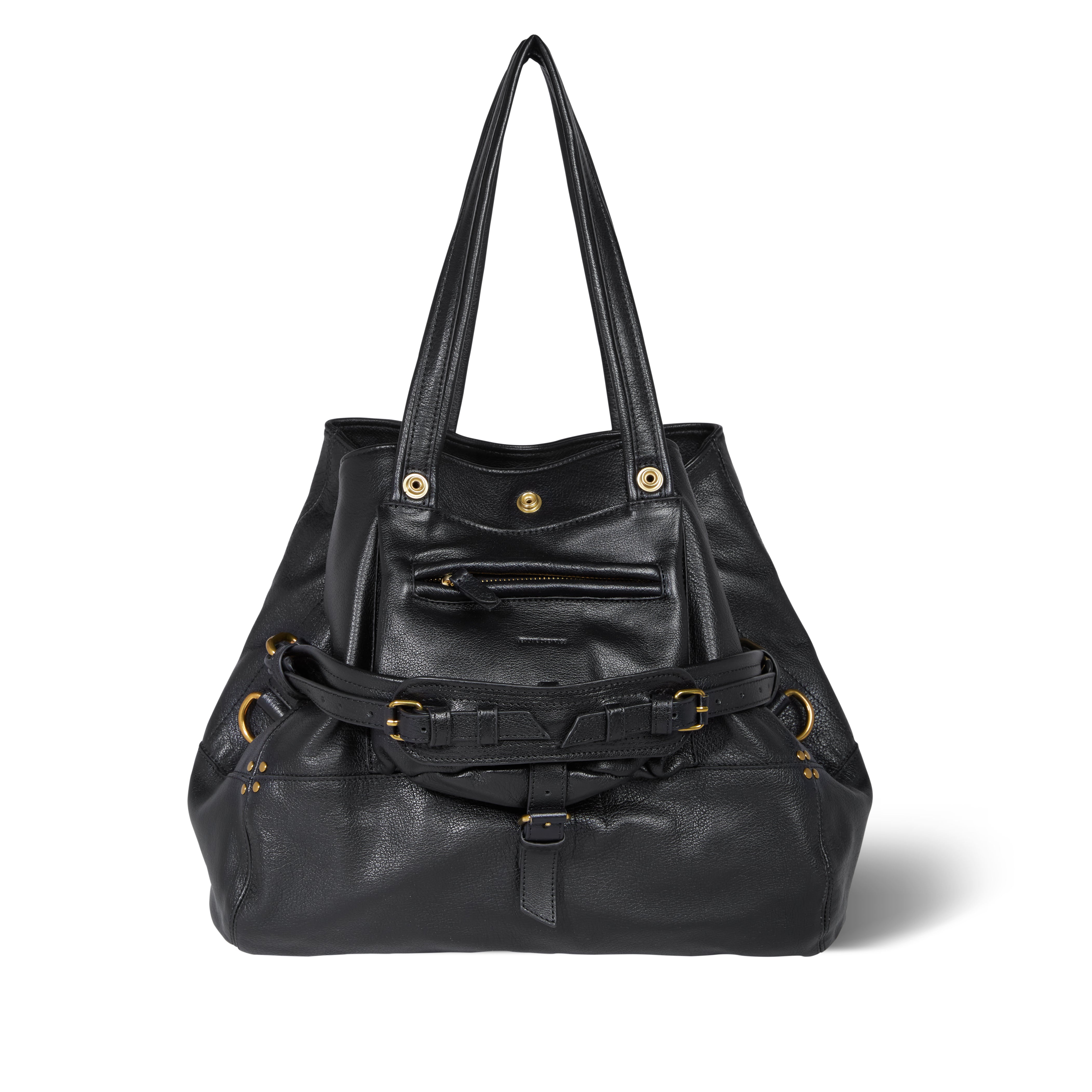 Deux poignées en cuir sur le haut du sac de hauteur 25 cm, longueur totale des anses 50 cm. Une bandoulière en cuir non ajustable de 48 cm. Une poche extérieure zippée sur l’avant du sac. Une poche intérieure. Un lien porte-clés à l’intérieur du sac.
