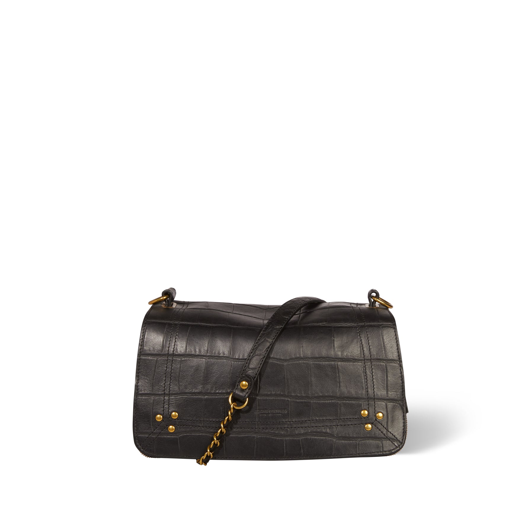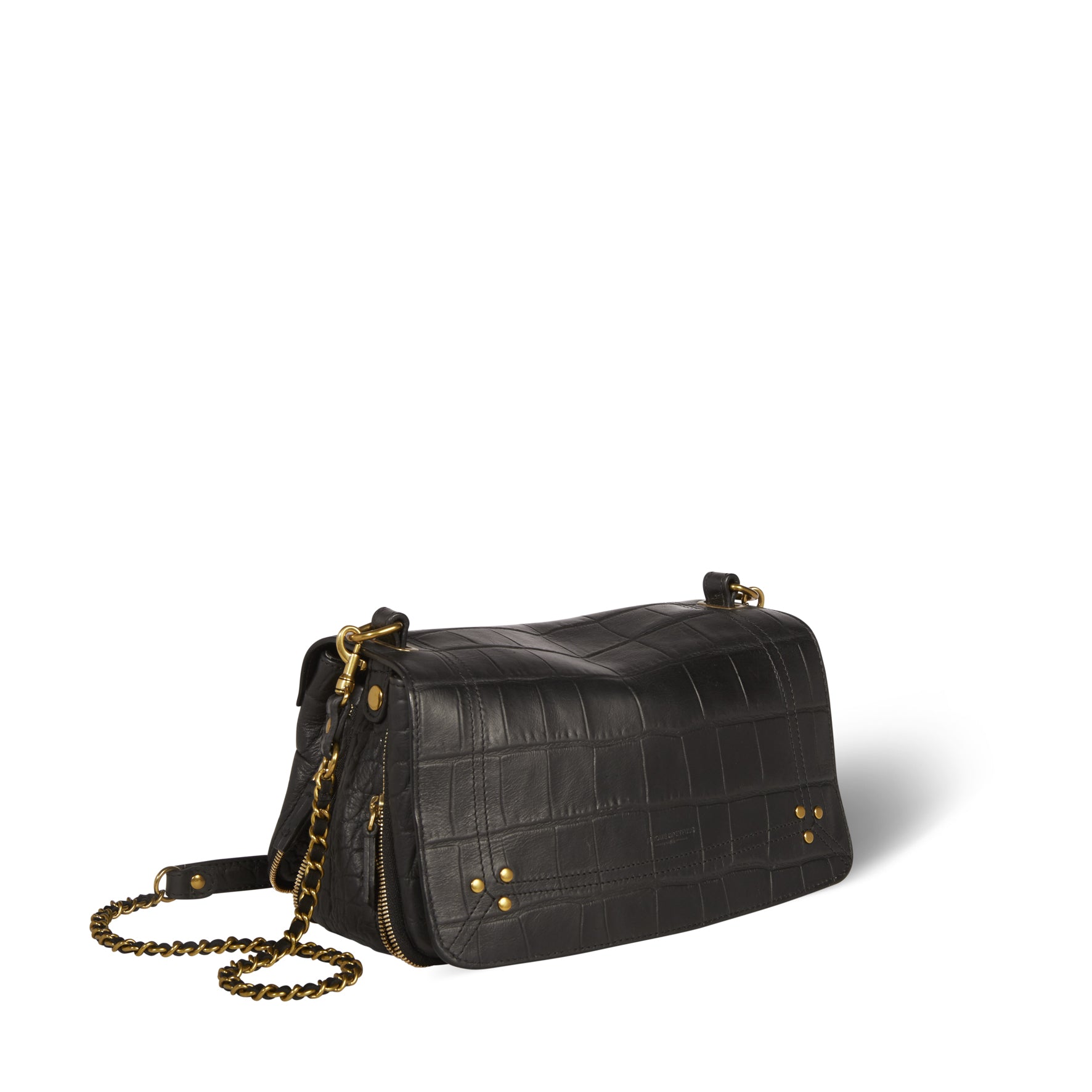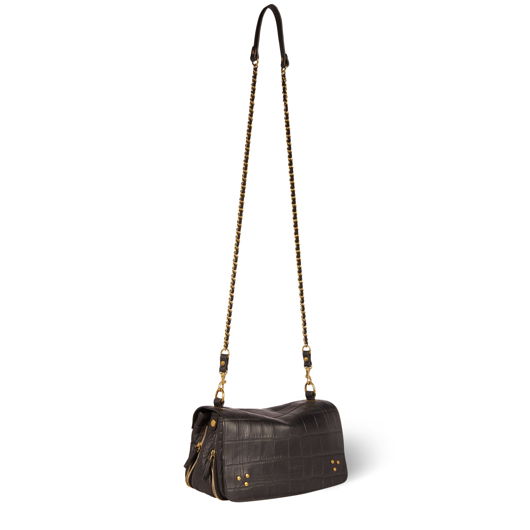 Sac bandoulière, porté à l'épaule ou en croisé. Bandoulière amovible en chaîne tressée de cuir réglable en deux longueurs. Fermeture par un rabat en cuir aimanté.