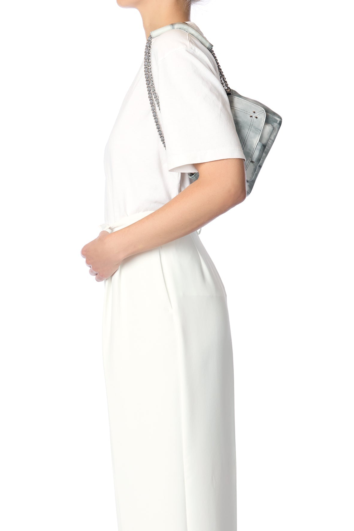 Une bandoulière chaîne et cuir amovible et ajustable en deux longueurs; mesurant au maximum 105 cm et dimension au plus court 52,5 cm avec large patte épaule en cuir pressionnée. Rabat avec fermeture aimantée. Sac organisé avec un grand compartiment et une poche zippée. Une petite poche sous le rabat. Une poche zippée à l'arrière. Un lien porte-clés à l’intérieur du sac.