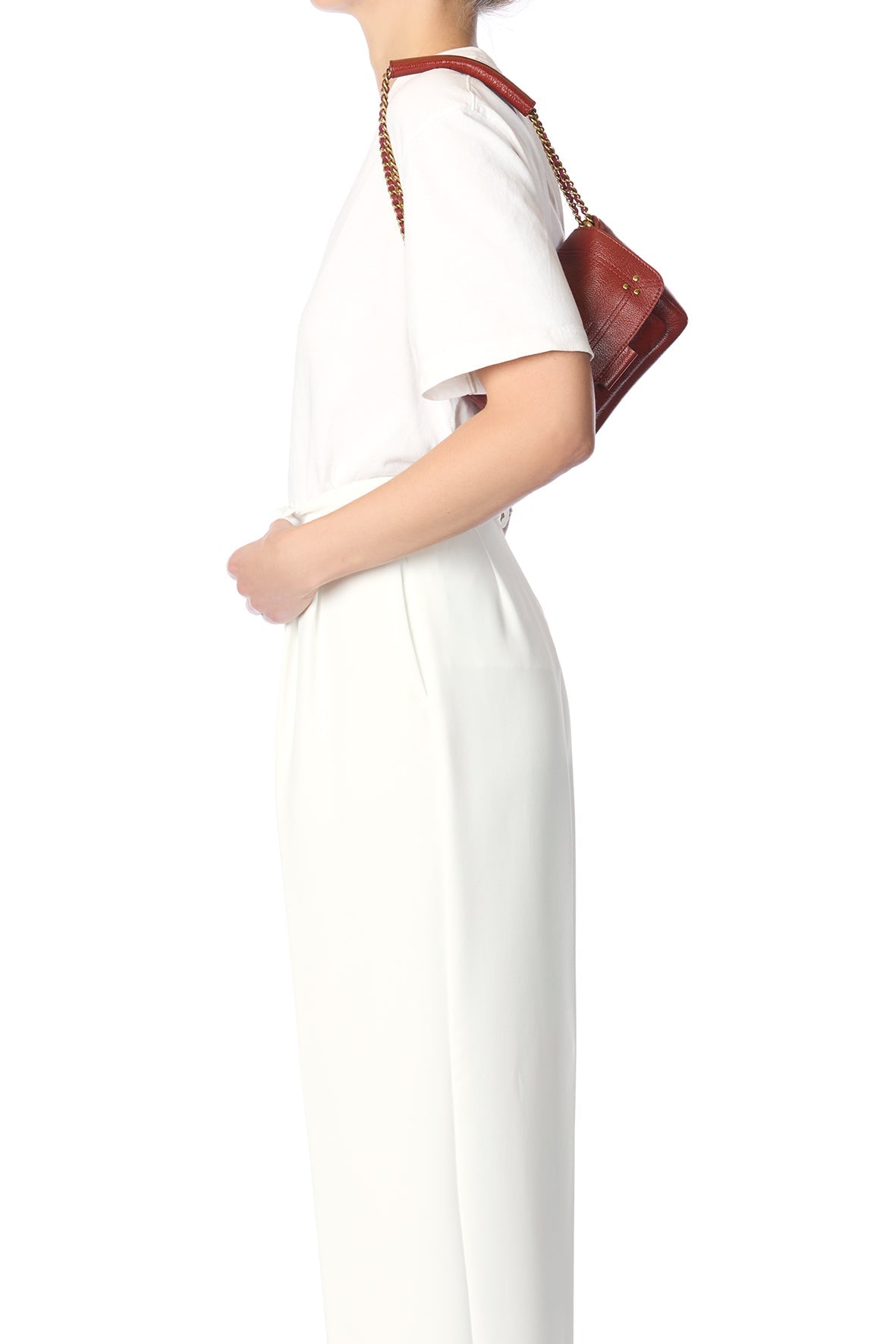 Une bandoulière chaîne et cuir amovible et ajustable en deux longueurs; mesurant au maximum 105 cm et dimension au plus court 52,5 cm avec large patte épaule en cuir pressionnée. Rabat avec fermeture aimantée. Sac organisé avec un grand compartiment et une poche zippée. Une petite poche sous le rabat. Une poche zippée à l'arrière. Un lien porte-clés à l’intérieur du sac.
