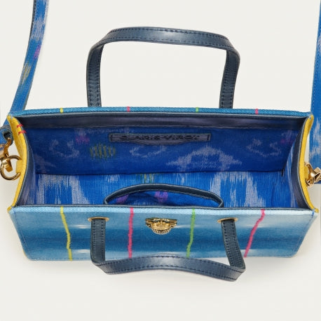 Ce nouveau mini cabas à la forme carré a été réalisé en tissu indigo Bogolan et en cuir suédé. Il peut se porter à la main ou à l’épaule, grâce à sa bandoulière prévue à cet effet. Orné d’une beetle à l’avant, notre mini Archi est composé d’un compartiment principal et d’une poche intérieure zippée ainsi que d’une poche ouverte. Cette mini version de notre cabas Archi s’associera facilement à tous types de tenues !