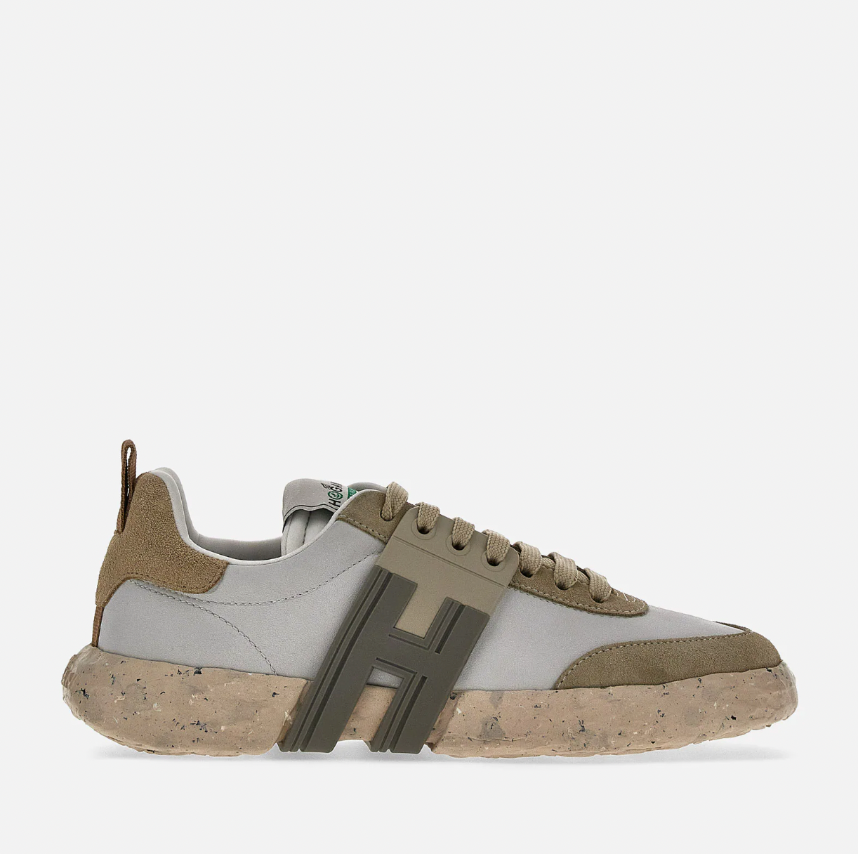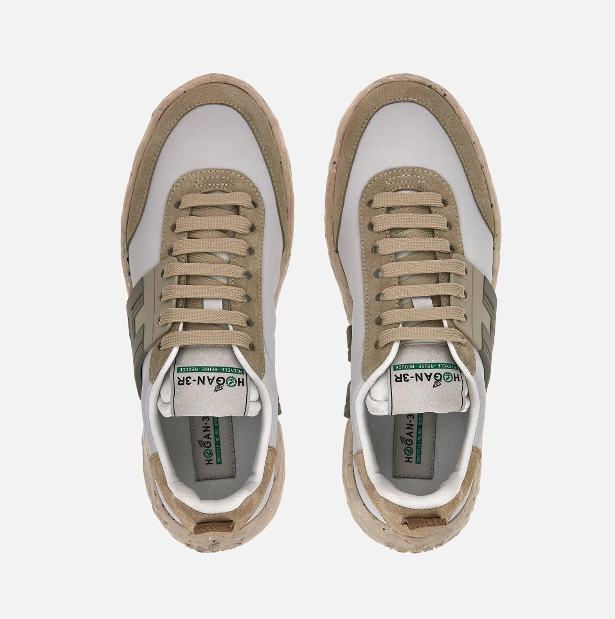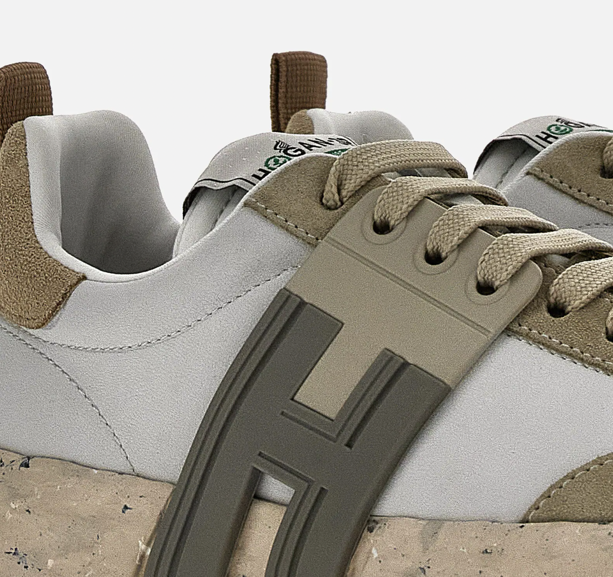 Recycle - Reuse - Reduce. La sneaker pour femme HOGAN-3R s'inspire de la nature que ce soit en termes de durabilité que d'esthétique. Sa base ultralégère, comprenant des matériaux de récupération, a une porosité qui évoque celle de la roche et se distingue du mouvement circulaire du maxi logo H en gomme. L'empeigne est réalisée dans un matériau innovant mélangeant des cuirs inutilisables à des fibres synthétiques, pensé pour réduire l'impact environnemental, par rapport au cuir utilisé d'habitude par la marque et en intensifier la légèreté et la résistance à l'usure. Les inserts en cuir velours sont tannés en limitant l'utilisation d'éléments chimiques.