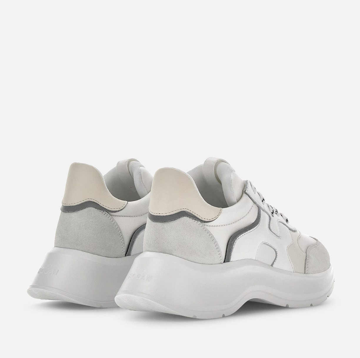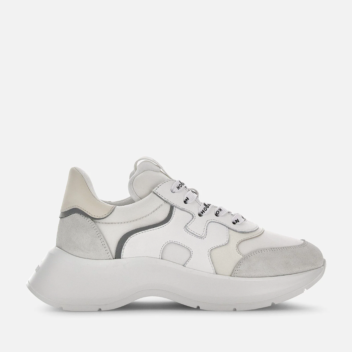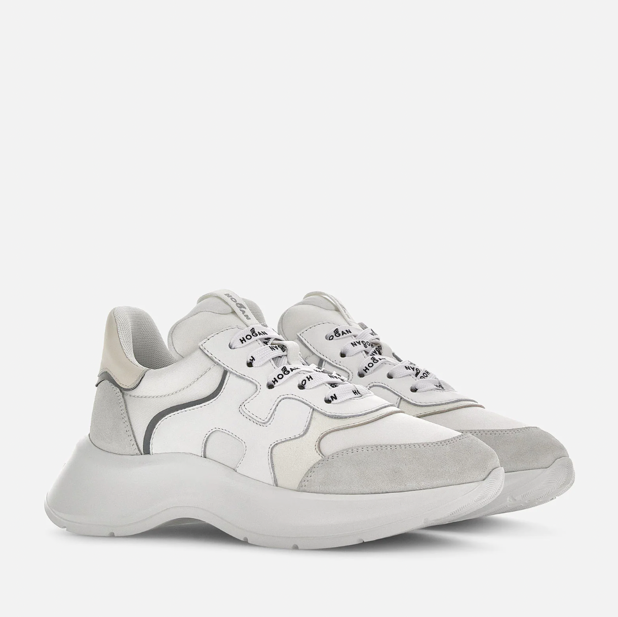 Nouveau modèle aux lignes sinueuses, la sneaker pour femme H585 se distingue par une semelle extra-light. L'empeigne en cuir lisse avec inserts en tissu technique présente des coutures ondulées qui soulignent le H latéral. Le laçage est orné de boucles en gros-grain, tandis que la semelle interne en mousse à mémoire de forme assure un chaussant amorti. Un modèle au caractère dynamique, dans une version résolument cool.