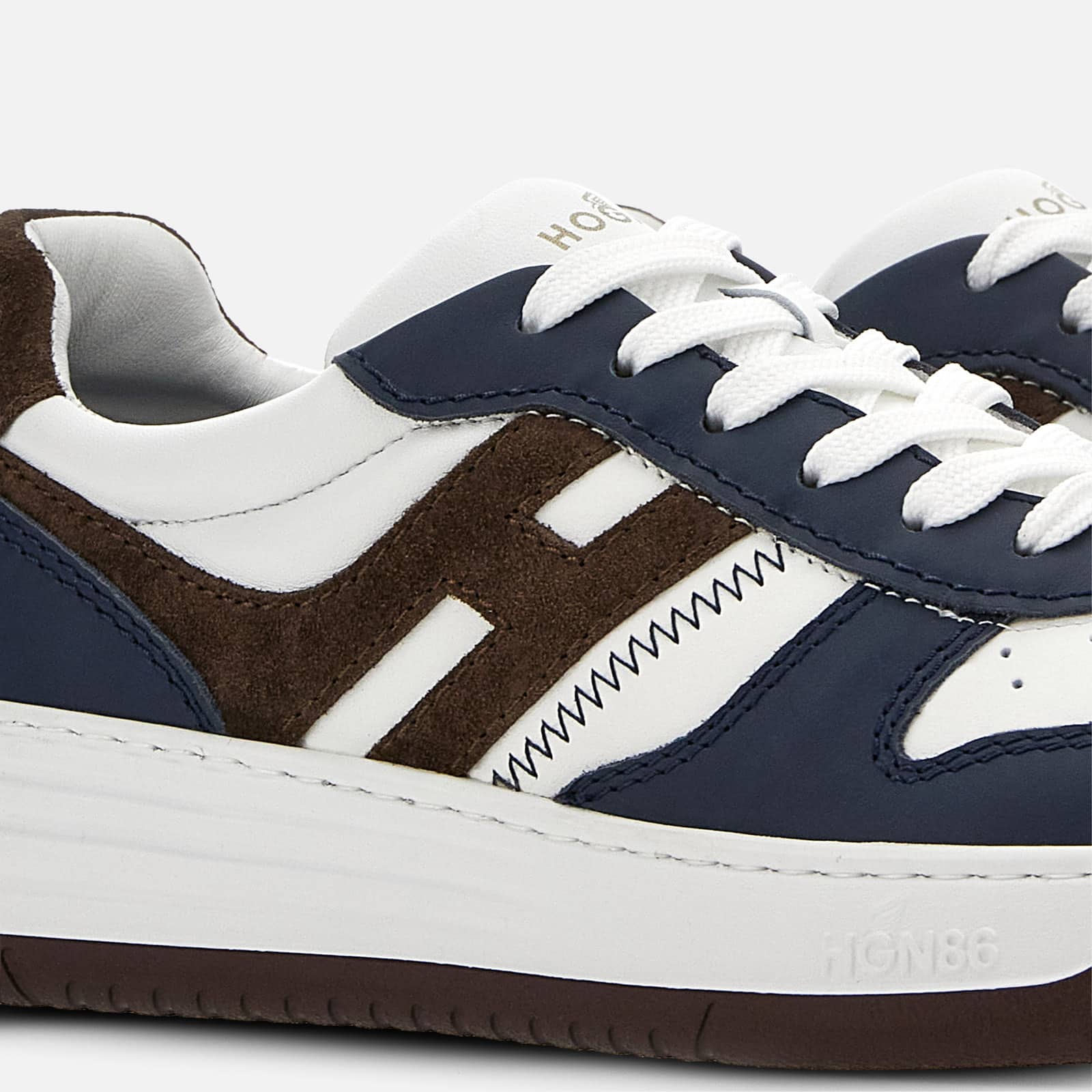 Nouvelle sneaker montante aux vibes rétro, la Hogan H630 High Top allie des lignes de l'univers du basket aux signes caractéristiques de la marque. Le dessus en cuir lisse avec inserts veloutés se distingue par un H allongé qui tourne autour du talon. La semelle est en EVA extralight, avec le nouveau logo HGN86 en relief sur le côté et des lignes nuancées rappelant les rainures historiques Rebel. Véritable must-have du vestiaire contemporain, ce modèle dynamique est complété par une semelle en mousse à mémoire de forme qui assure souplesse et amorti.