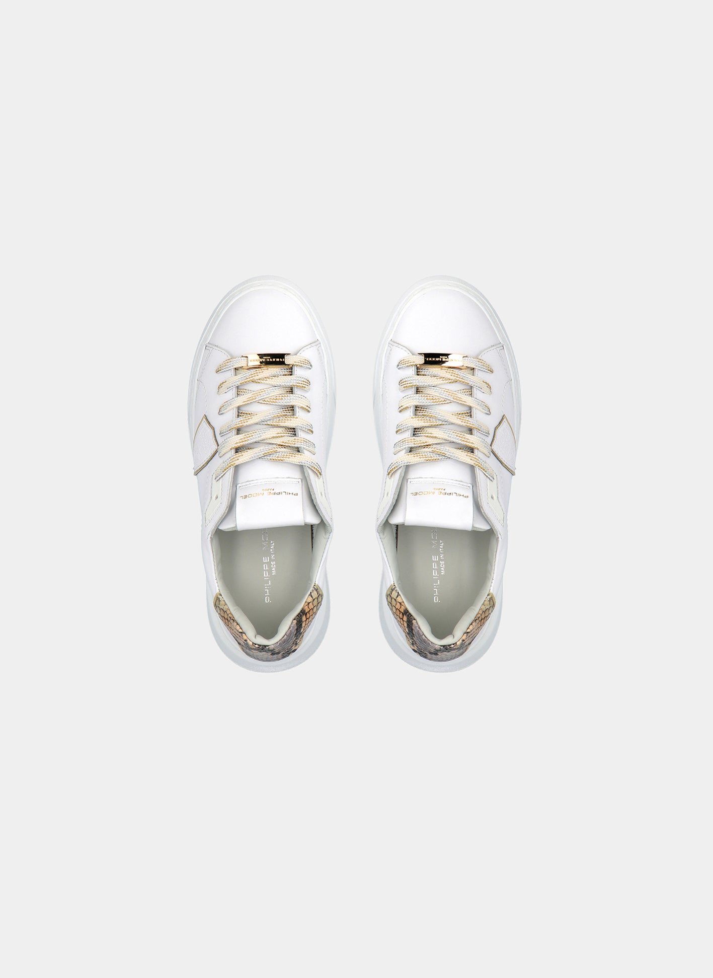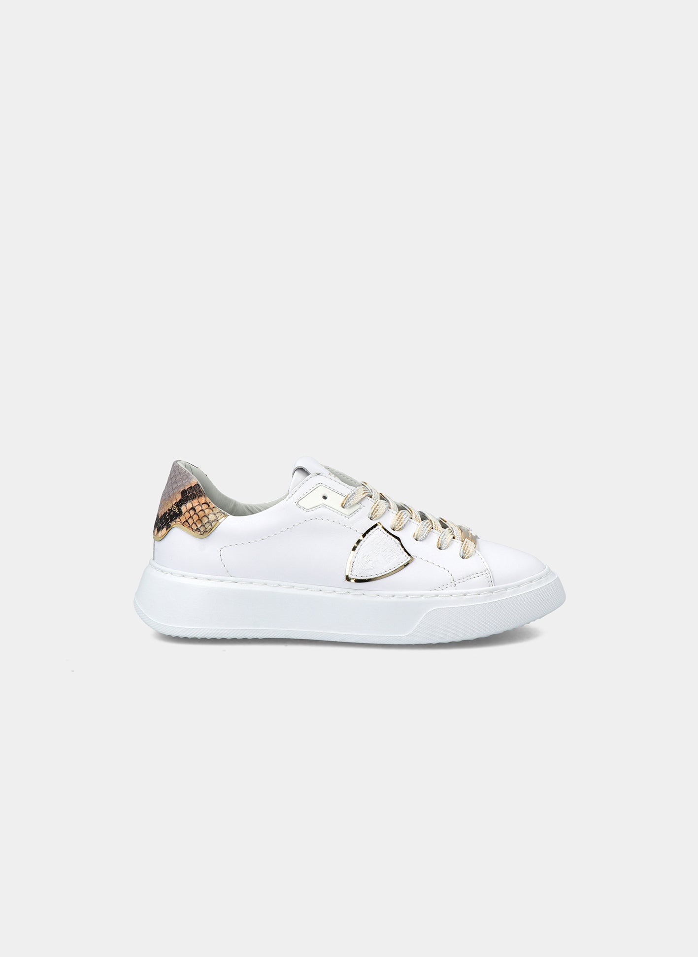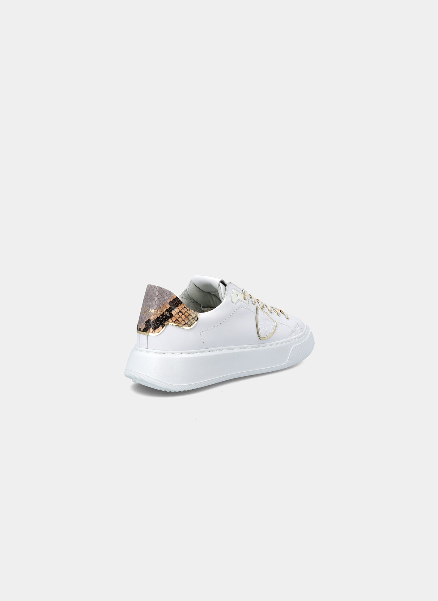 Temple est la basket haute couture inspirée des années 90 de Philippe Model Paris. Ce modèle en cuir de veau pour femme, doté d'un tissu à effet miroir et de détails en cuir imprimé serpent, représente un compromis parfait entre style et confort. Grâce également à une semelle en matériau léger et confortable.