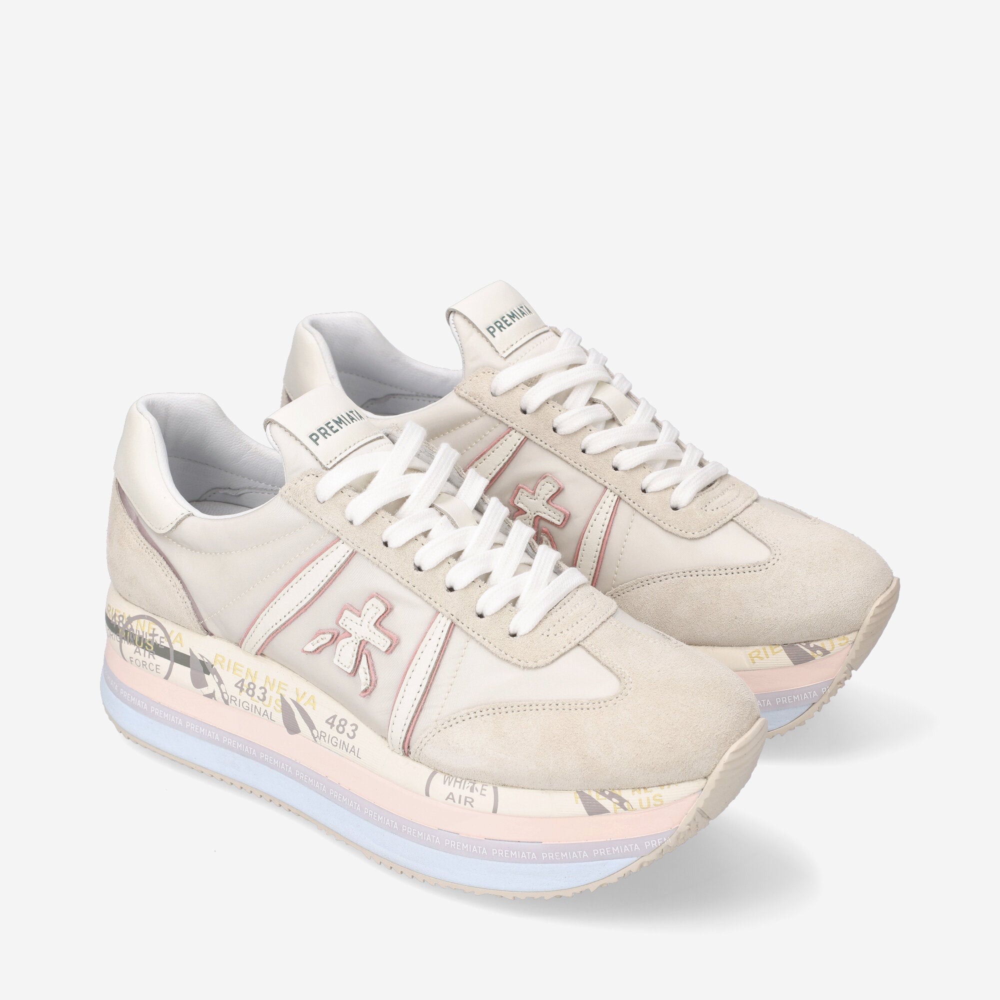 Fusion d'esthétique contemporaine et rétro, la Beth associe une silhouette rétro à une semelle plateforme surdimensionnée. La tige présente un mélange harmonieux de nylon crème avec des accents de daim crème . Cette pièce est complétée par des lacets blancs complémentaires.