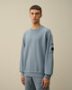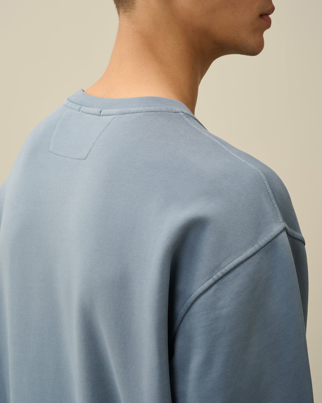 Sweat-shirt à col ras du cou confectionné en polaire de gaze émerisée en brossé à tissage diagonal. Le traitement de teinture par réserve (Resist Dyed) crée un effet brut, et met en relief les coutures du vêtement.