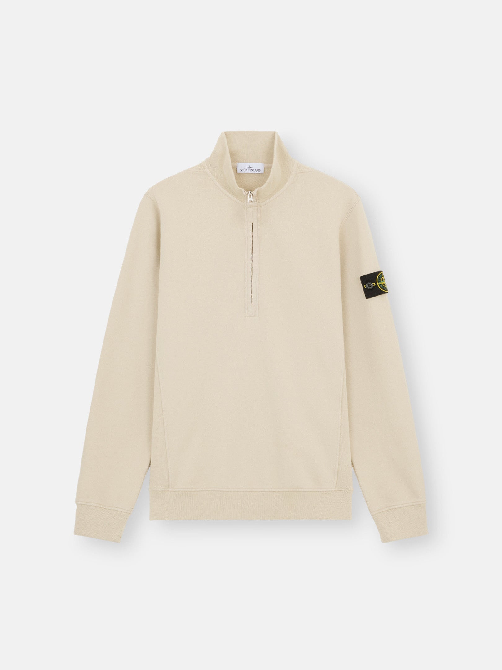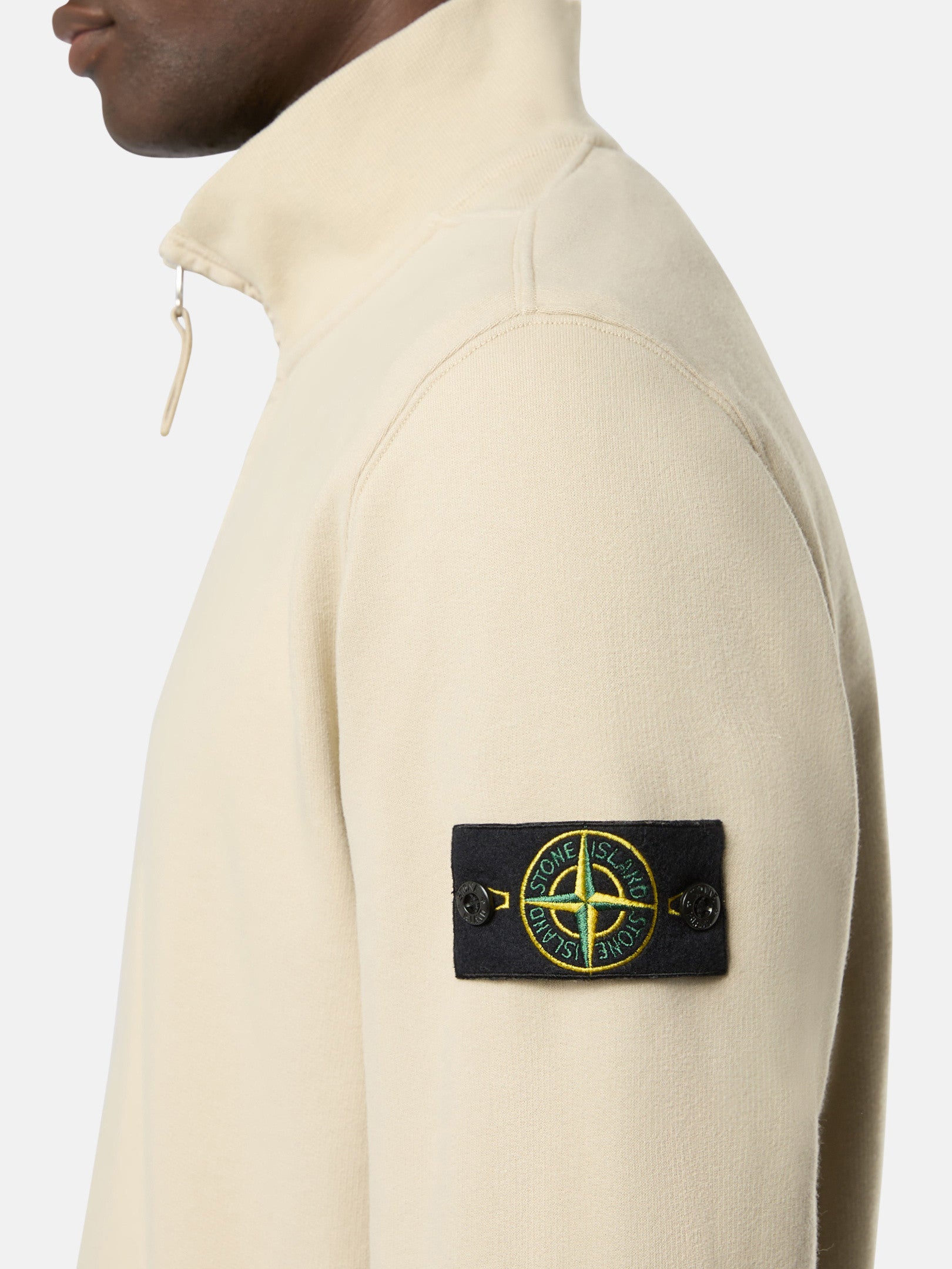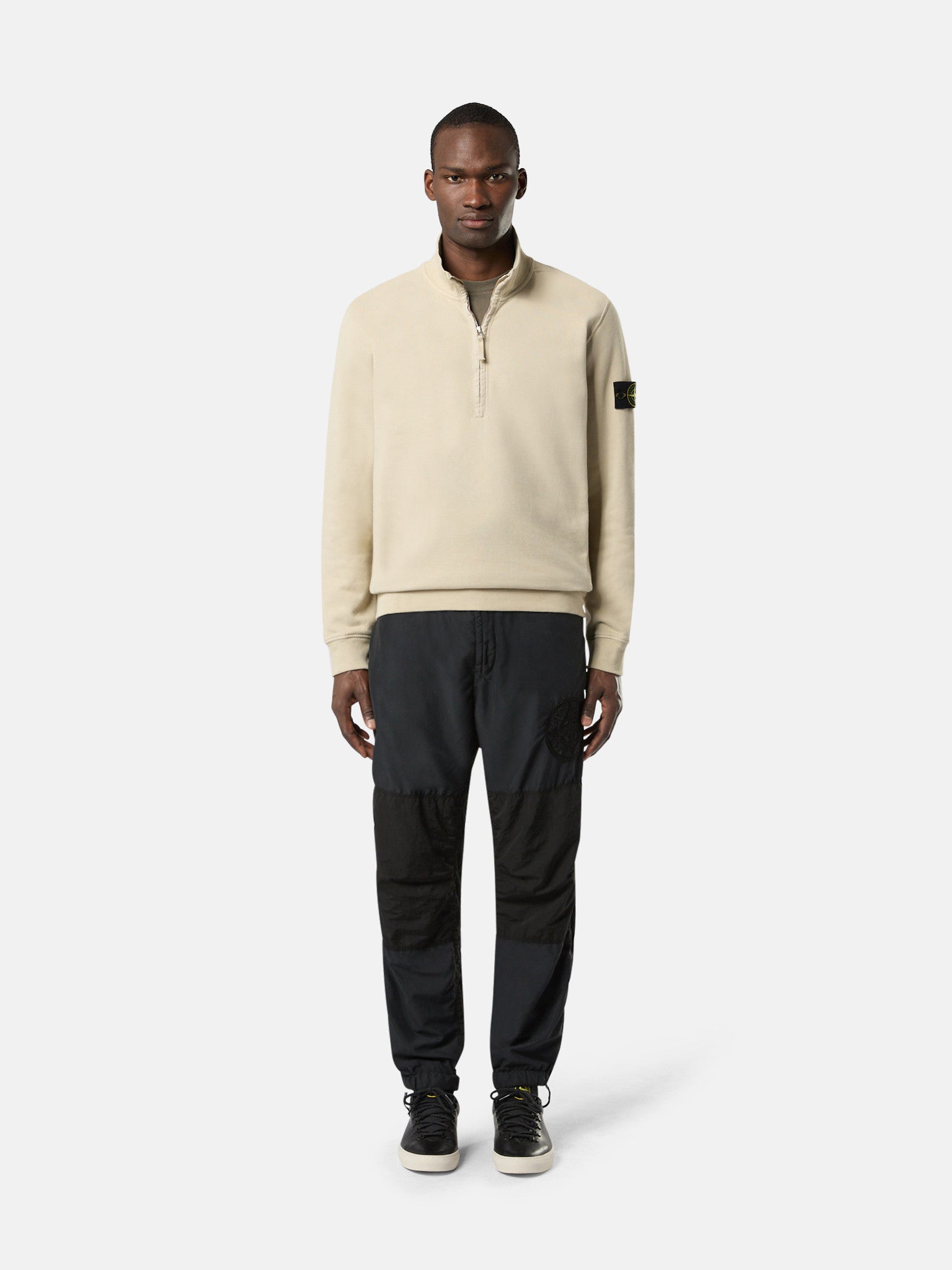 Col montant avec fermeture zippée bordée de sergé de coton. Coupe classique. Bandes côtelées en coton sur les côtés. Écusson Stone Island sur la manche gauche. Poignets et ourlet côtelés. Coupe classique.