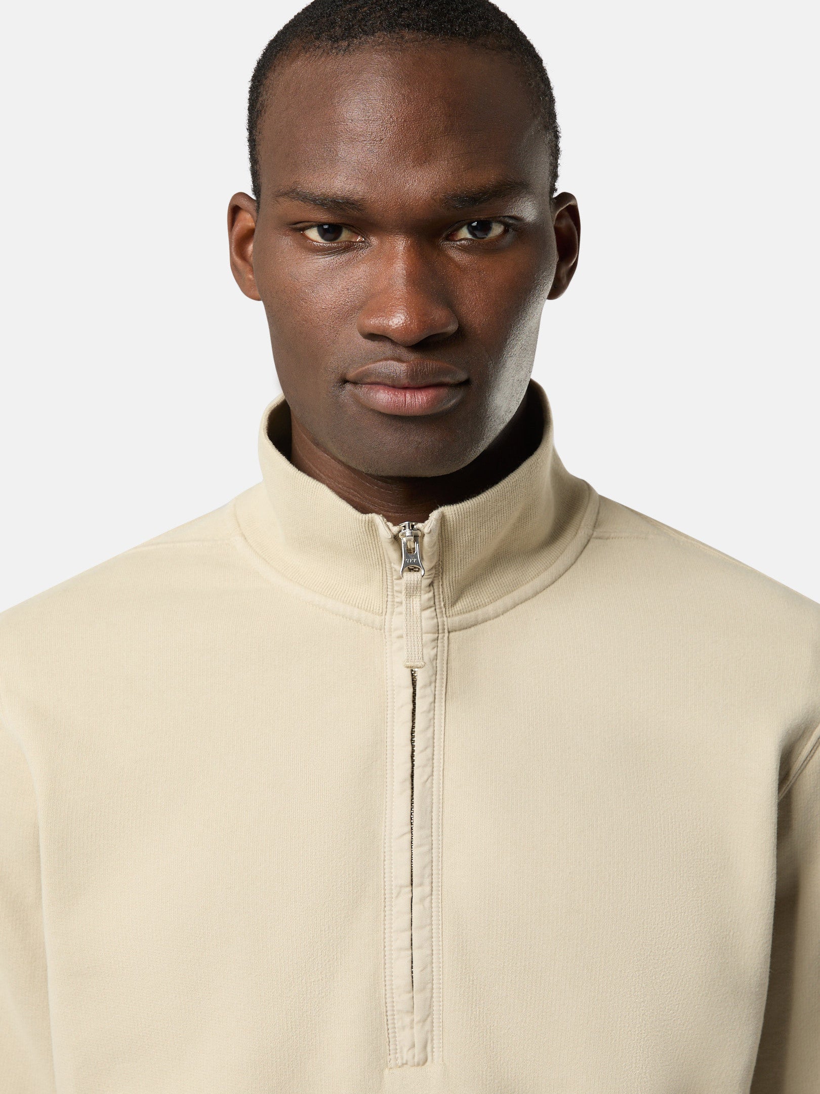 Sweat-shirt à col zippé en coton biologique molletonné gratté. Modèle teint en pièce.