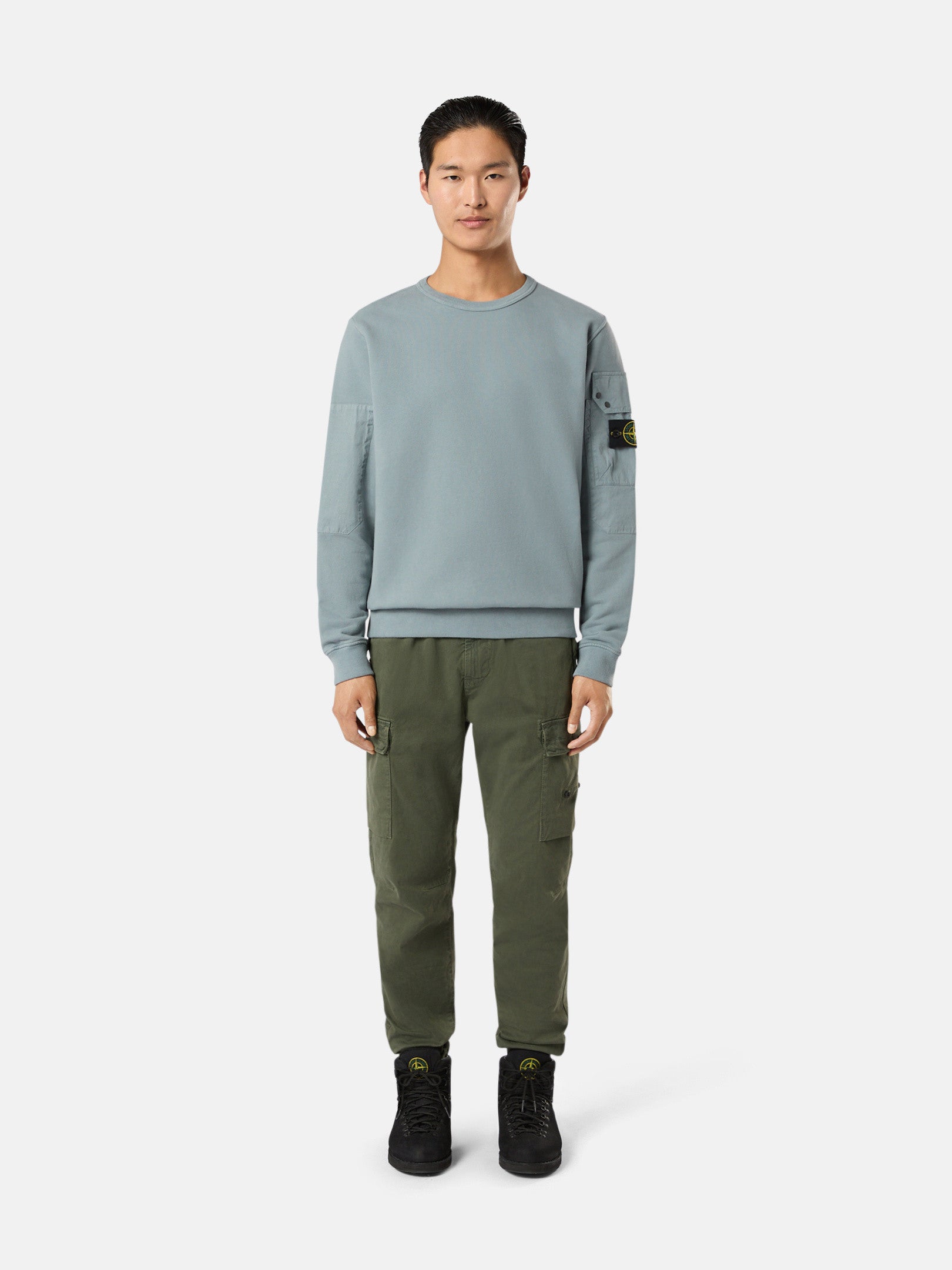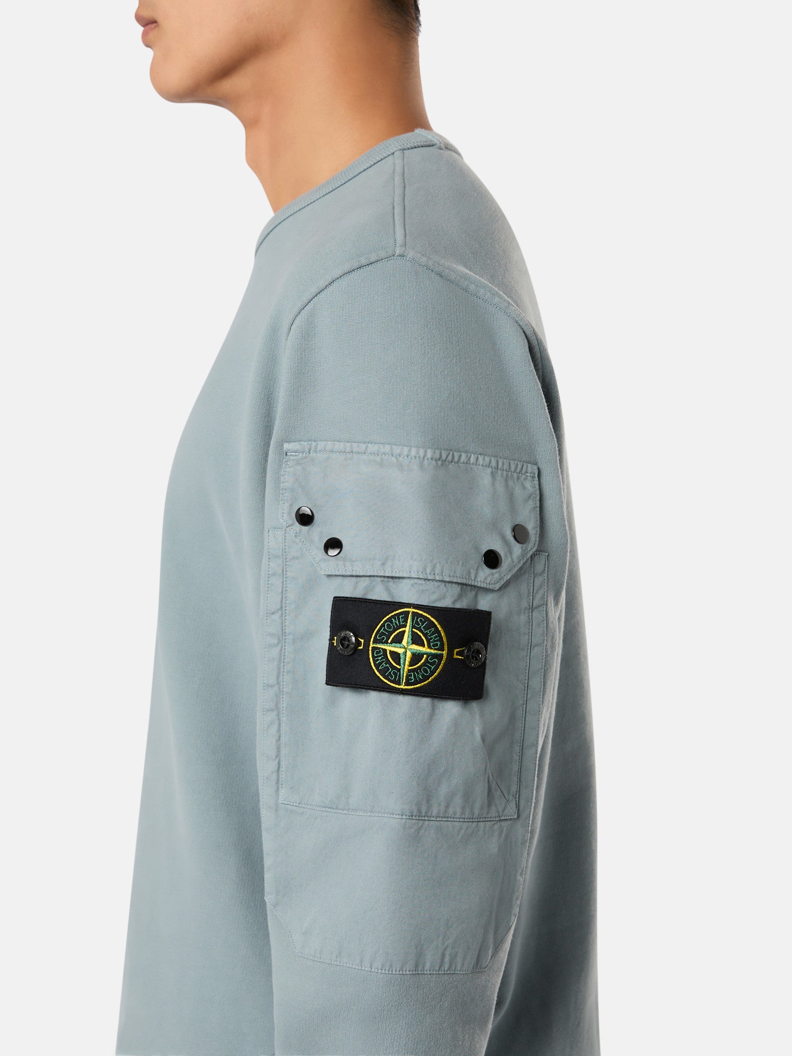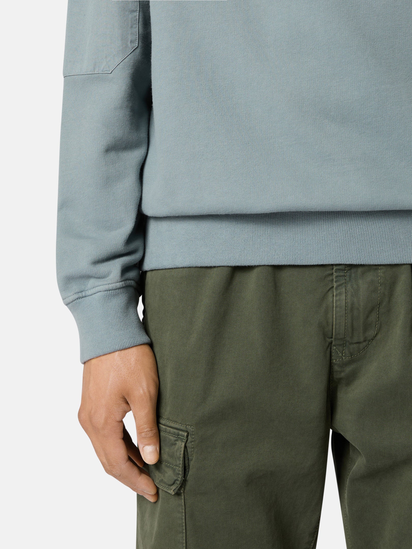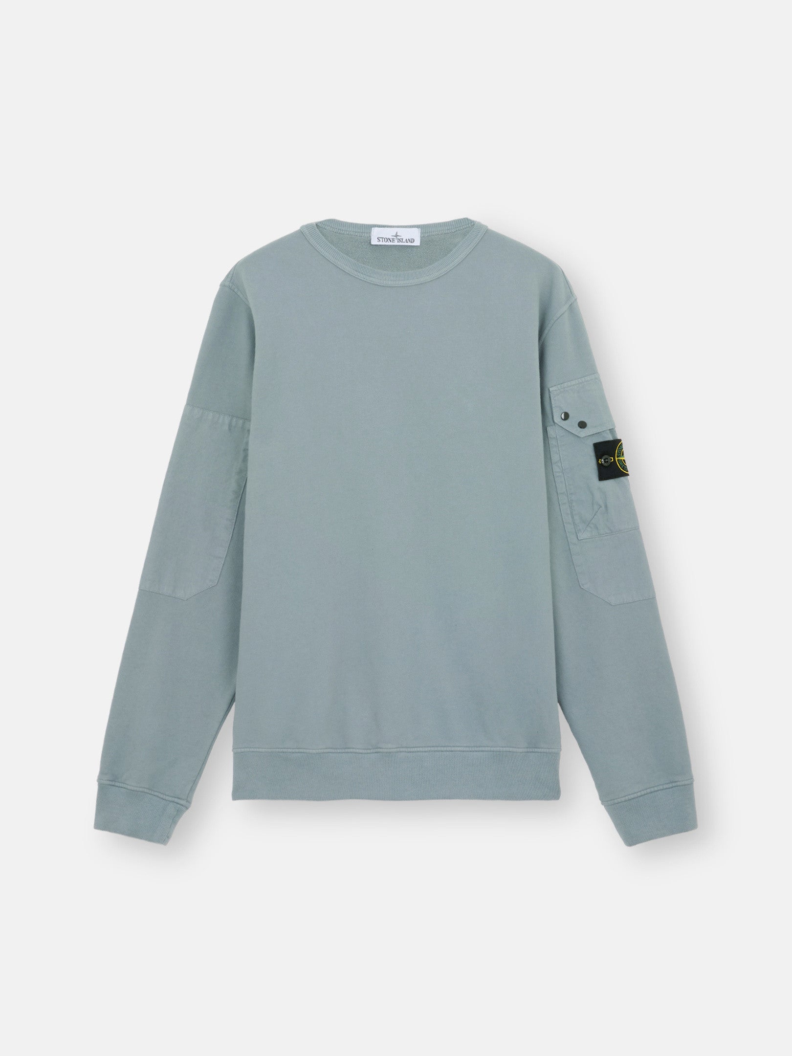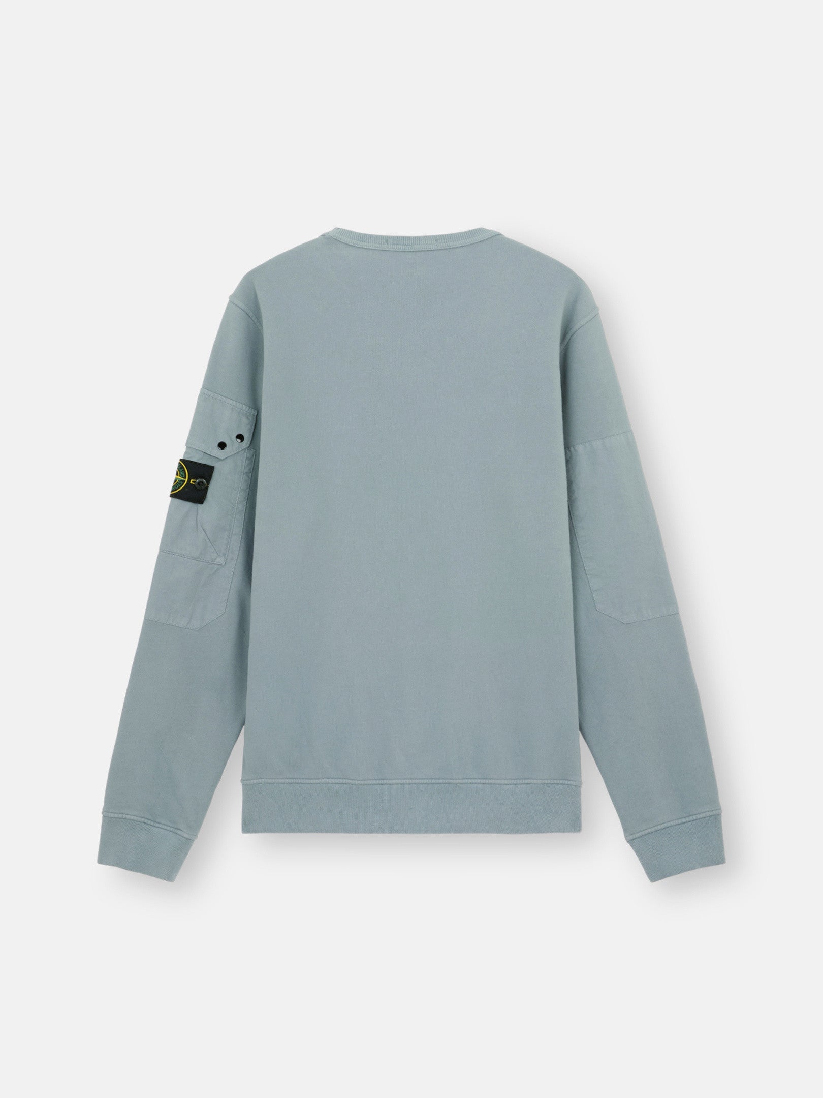 Sweat-shirt ras-du-cou en coton biologique molletonné gratté avec renforts en sergé de coton sur les manches et poche avec bouton-pression et rabat. Modèle teint en pièce.