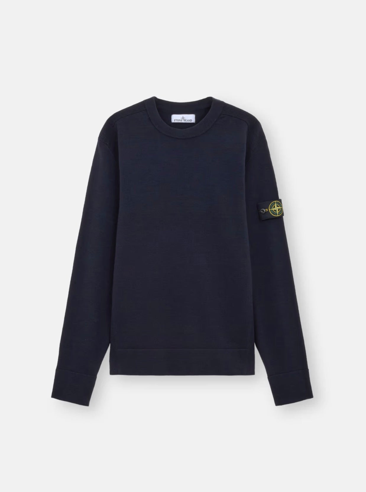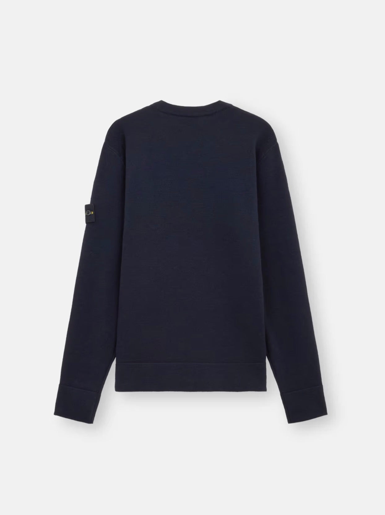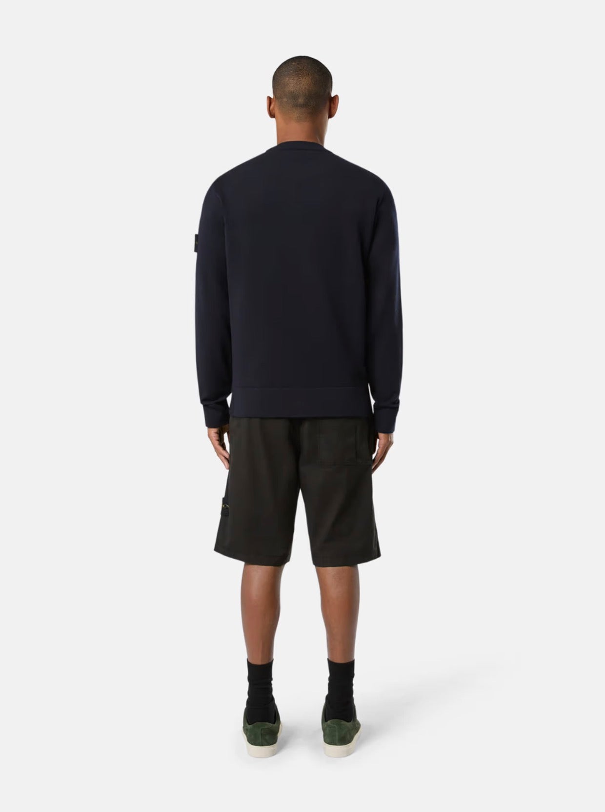 Pull ras-du-cou en maille de laine stretch certifiée RWS. Point jersey. Jauge 12. Le label Responsible Wool Standard (RWS) décrit et certifie les pratiques en matière de bien-être animal et de gestion des sols utilisés pour la production de la laine et assure le suivi des matières certifiées, de l'exploitation au produit final.