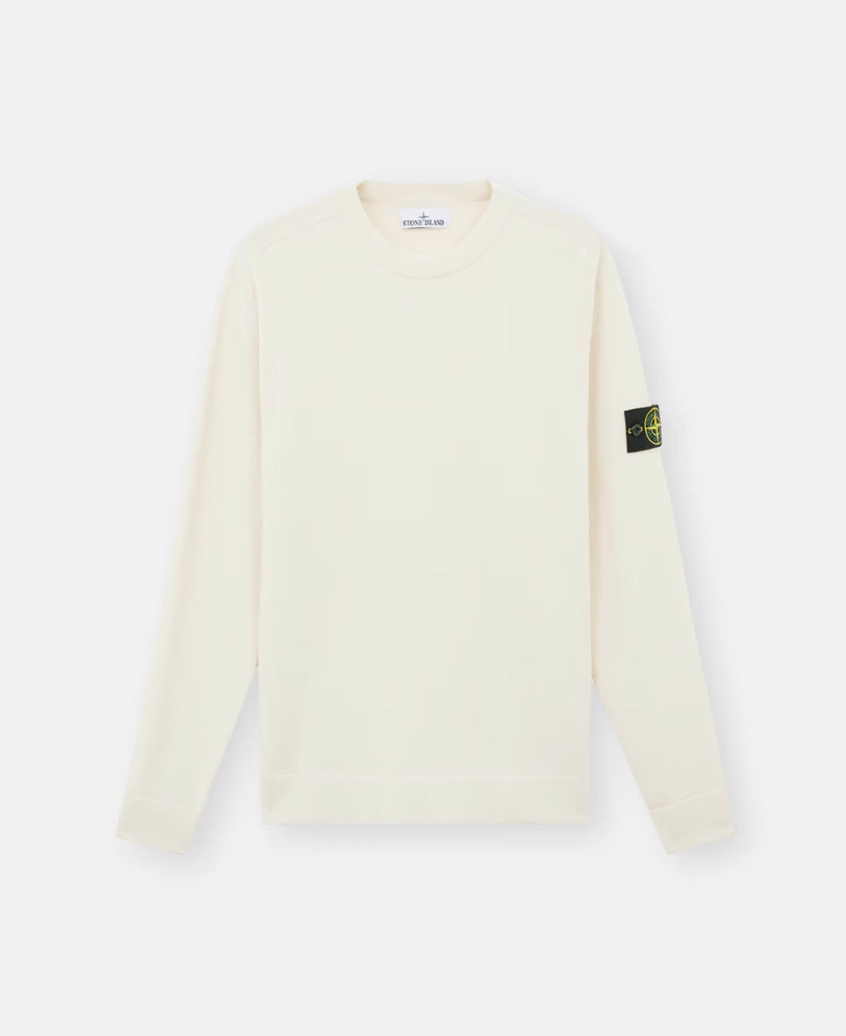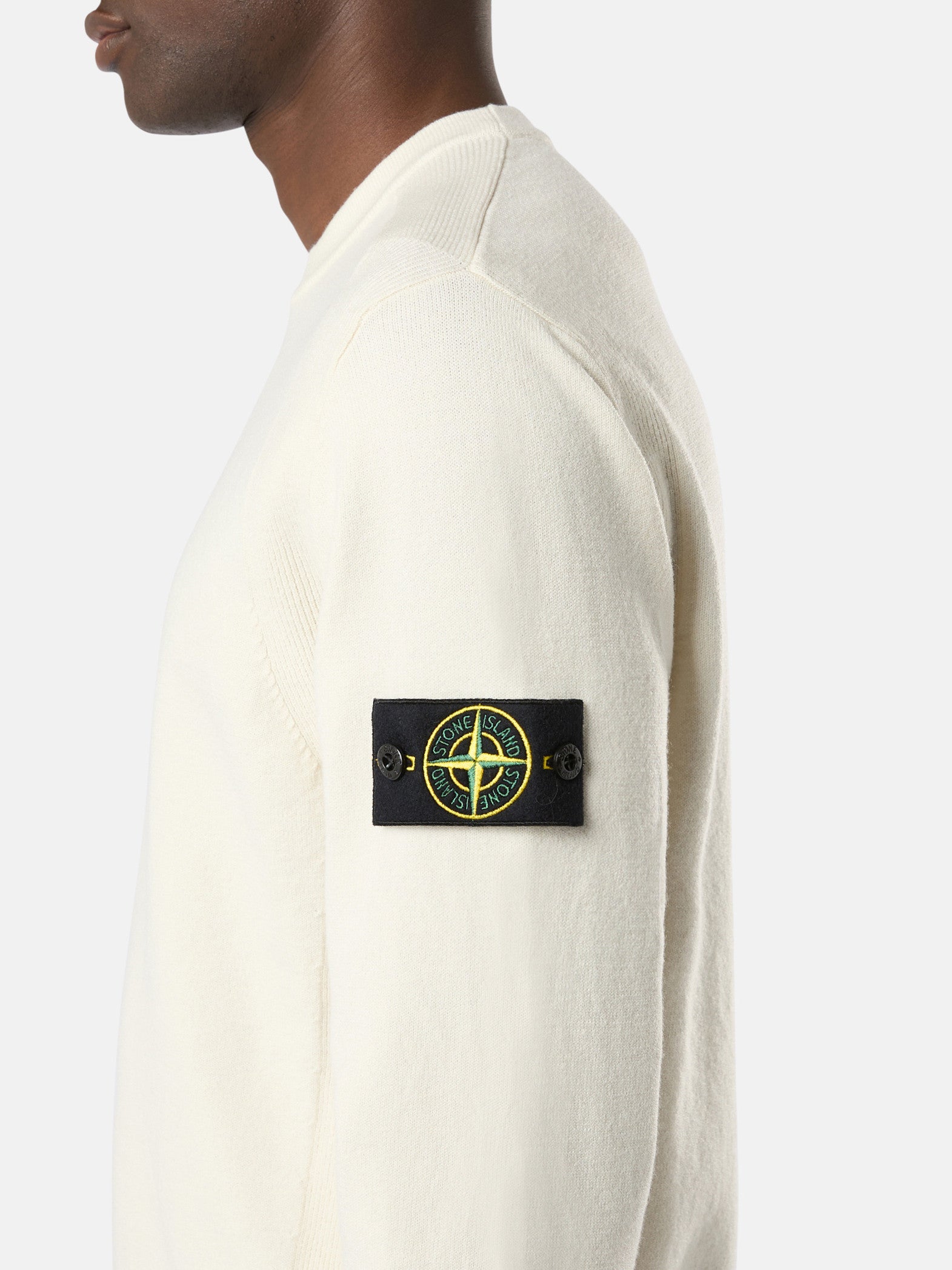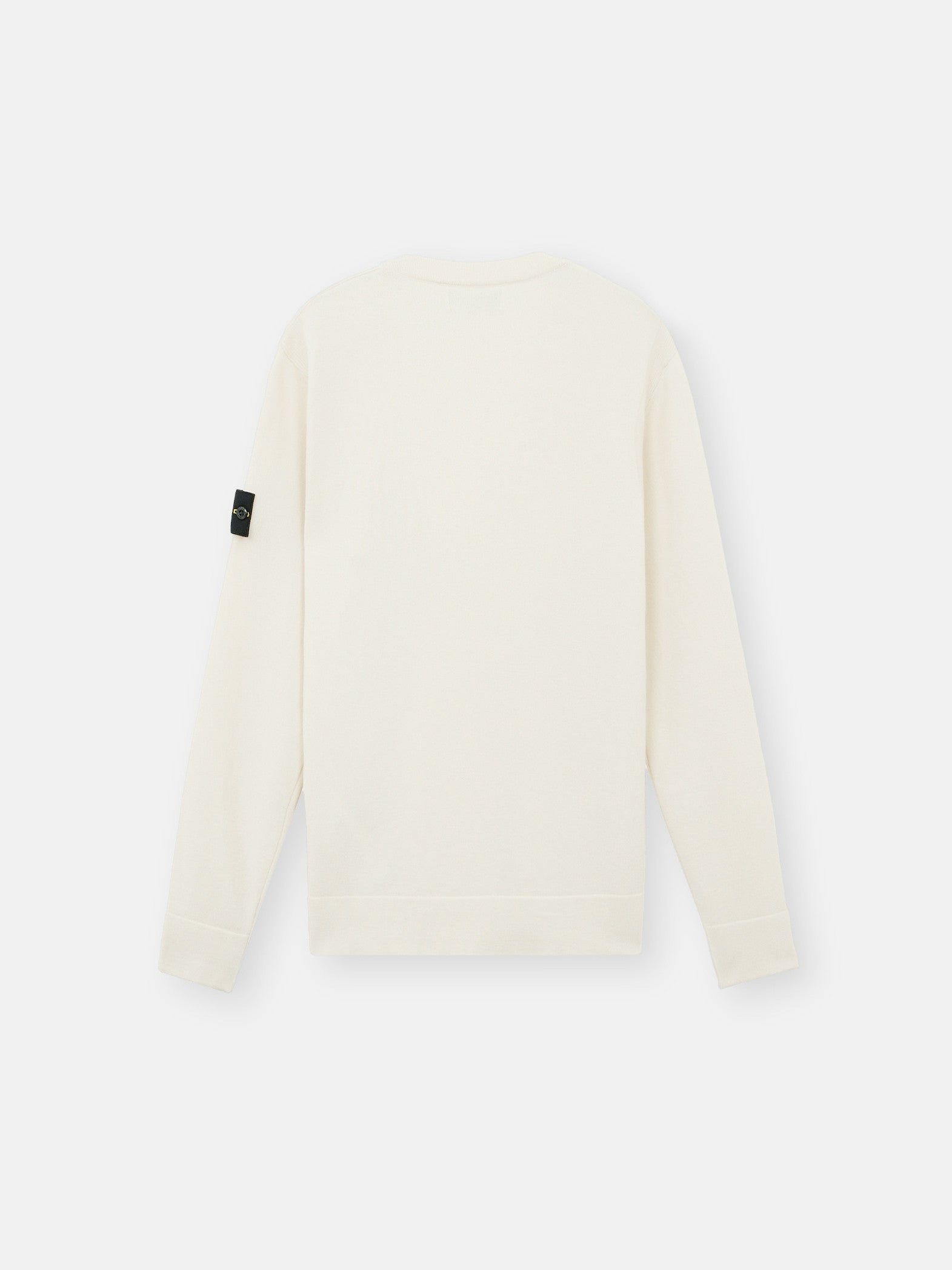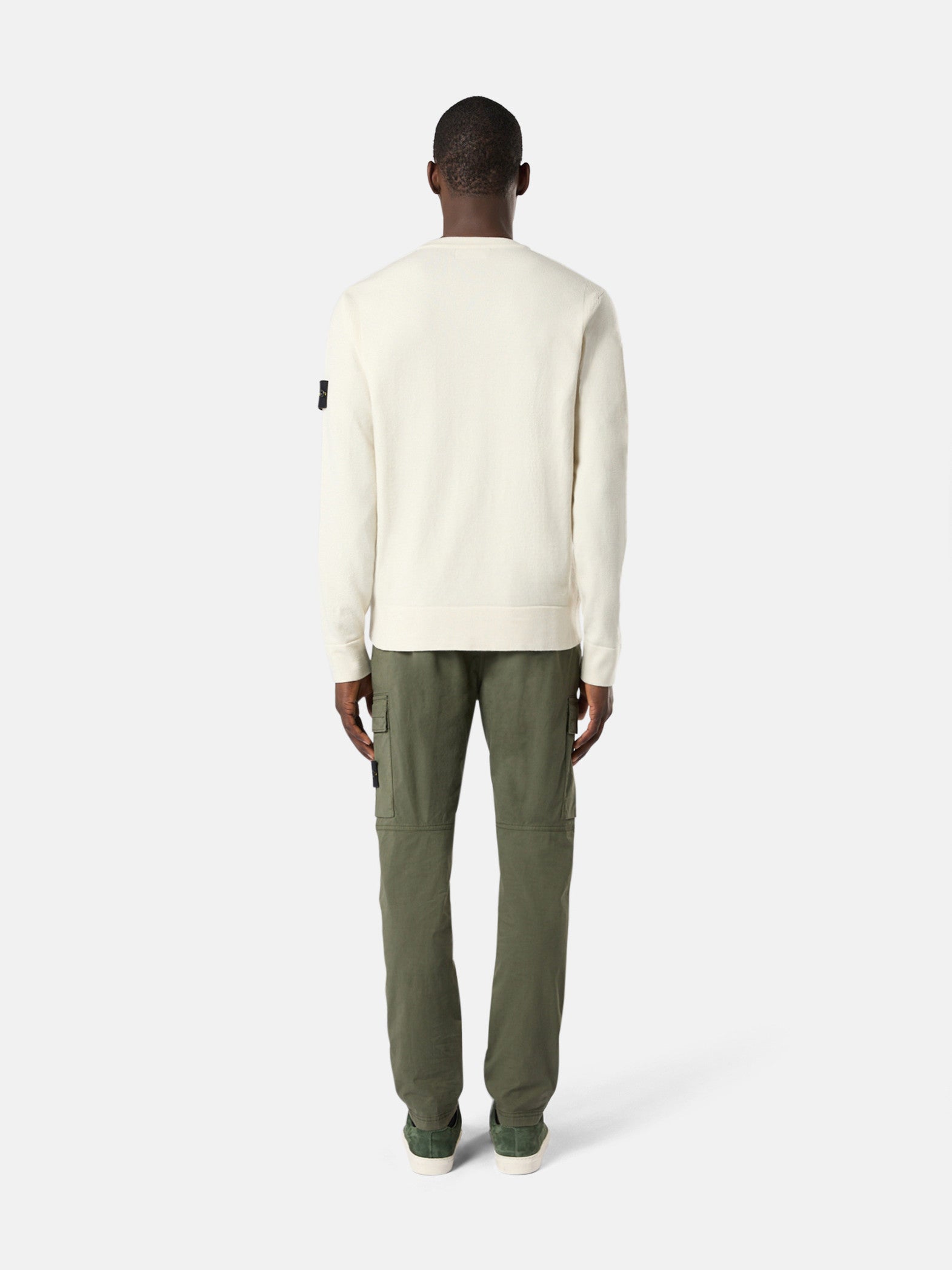 Pull ras-du-cou au point jersey en maille de laine stretch certifiée RWS doté de détails côtelés au niveau du col, des épaules, des emmanchures et des côtés. Jauge 12.