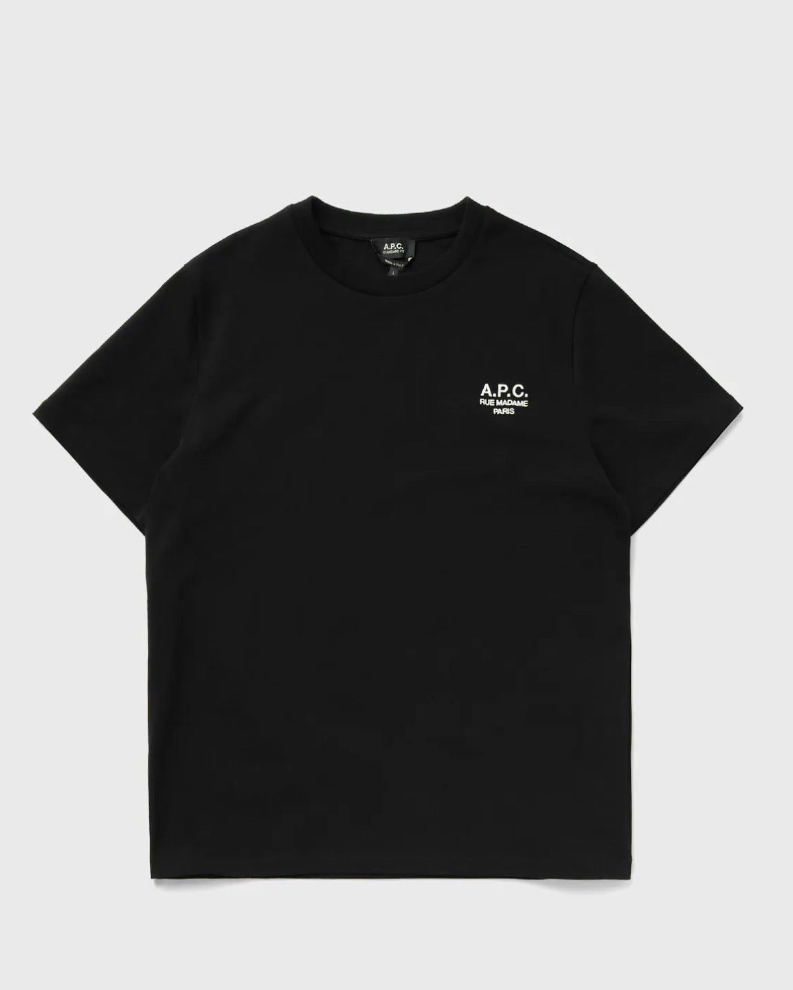Le T-shirt A.P.C. Rue Madame Logo est confectionné en pur coton et présente une coupe régulière, des manches courtes et un col rond côtelé. Un logo brodé sur la poitrine complète le design.
