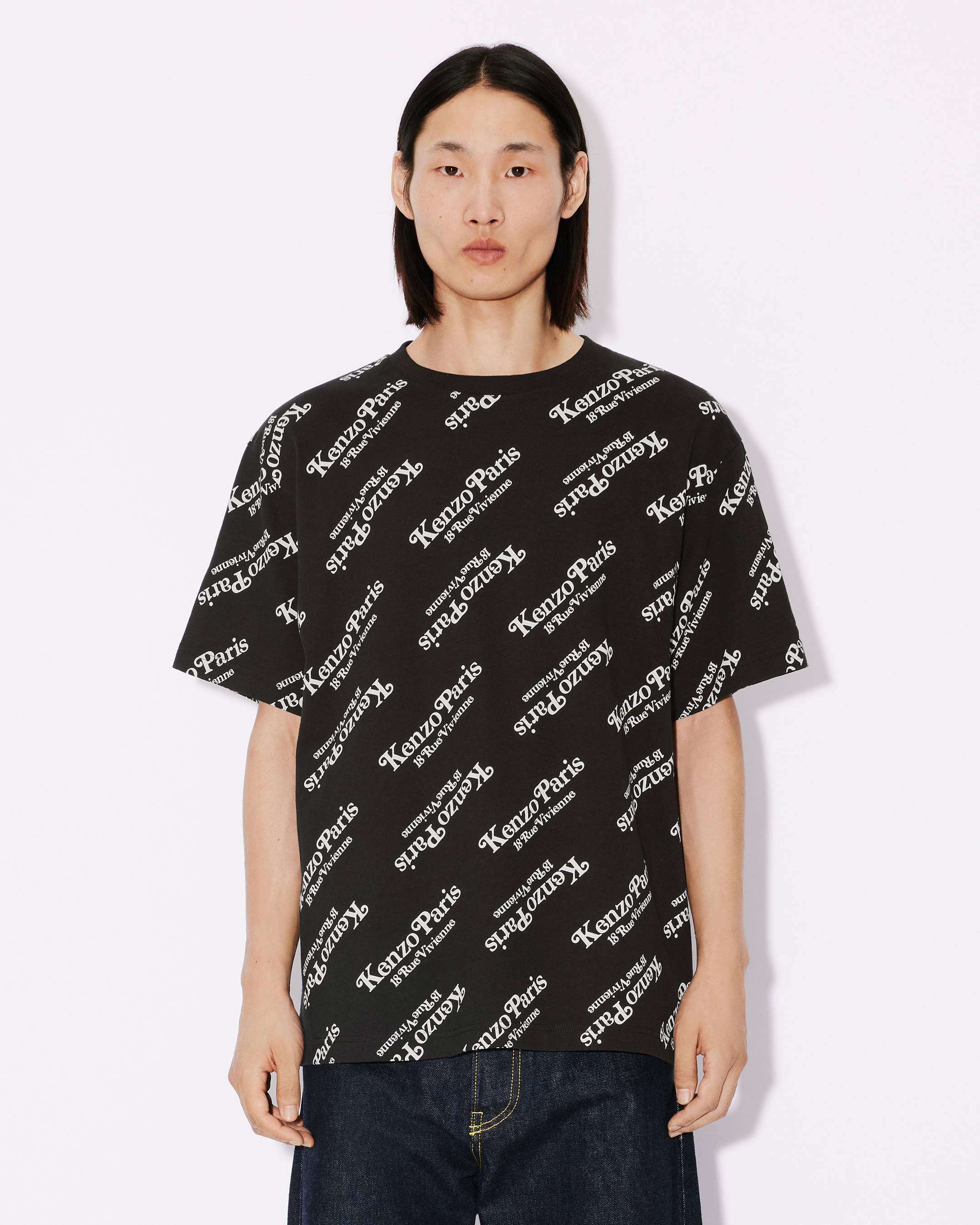 Ce t-shirt est une pièce emblématique de la collection 'KENZO by Verdy'. Il arbore l'imprimé monogramme 'KENZO Paris 18 rue Vivienne' en all-over, signature de la collaboration entre la Maison et le designer tokyote. La coupe oversize confère un côté streetwear à ce futur basique. On aime la composition en jersey, chère à l'univers de Nigo.