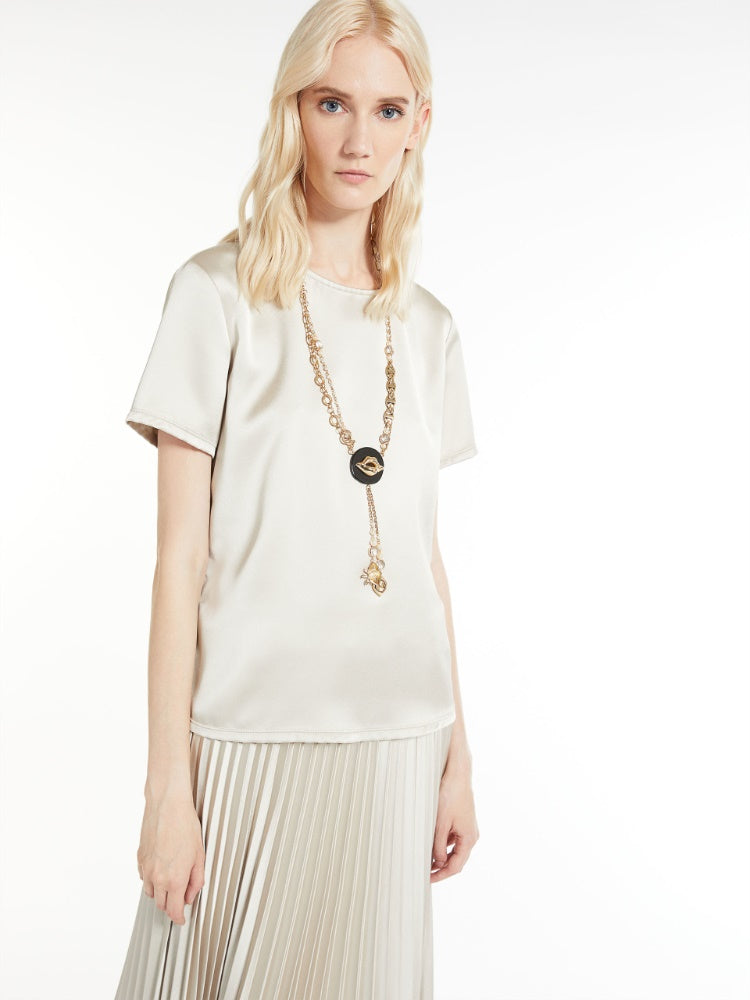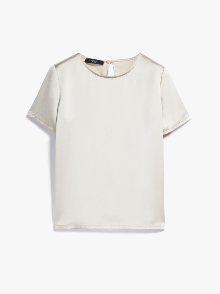 T-shirt en satin sur le devant et les manches et en jersey lyocell dans le dos, coupe droite. Le modèle présente un col rond avec goutte dans le dos et des manches courtes.