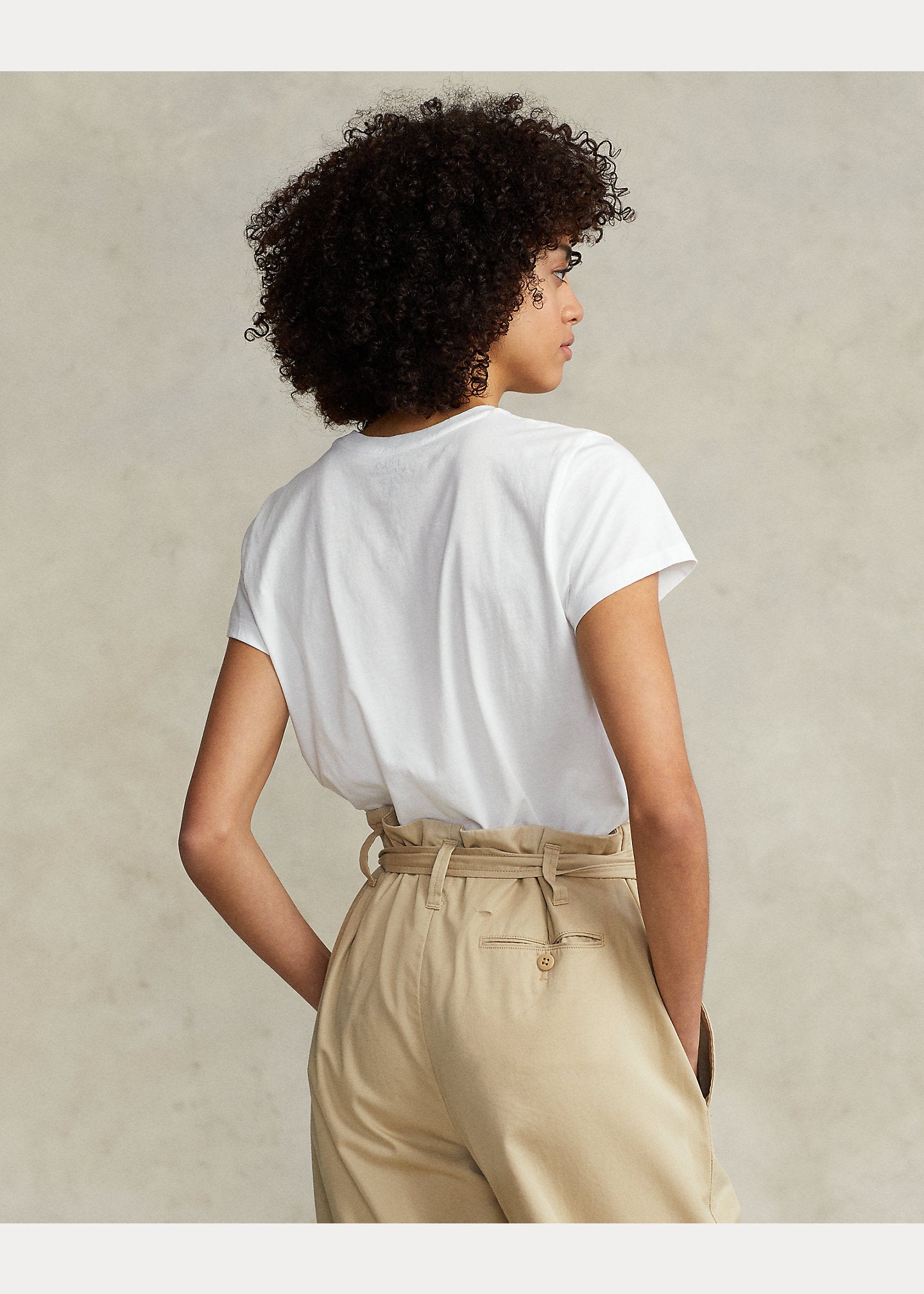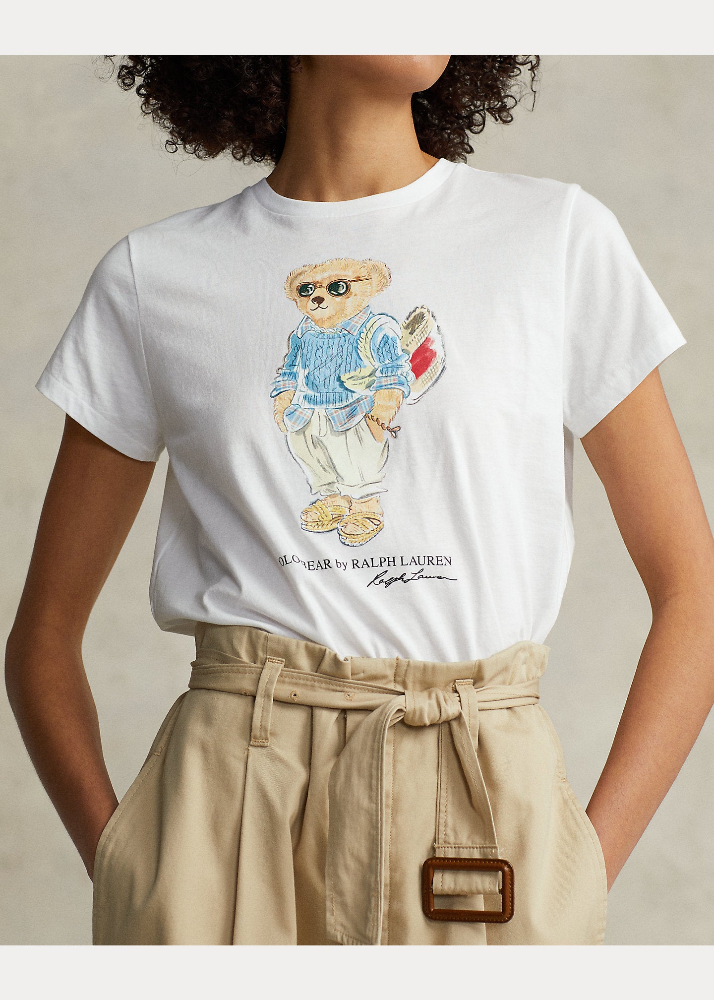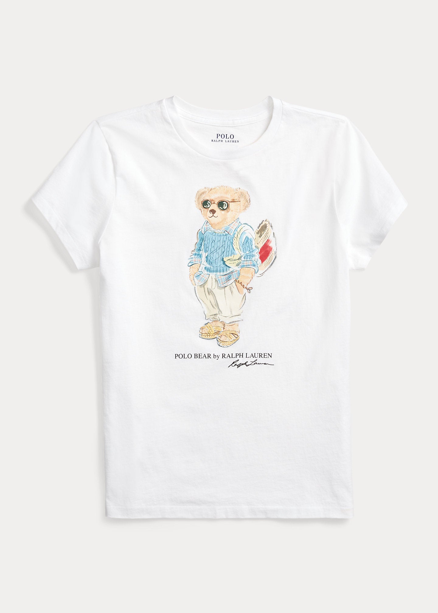 Ce t-shirt en jersey de coton arbore notre Polo Bear adoré élégamment vêtu pour l'été d'un pull torsadé en coton léger, d'un pantalon chino à pinces, d'un cabas en raphia et d'espadrilles à lanières.