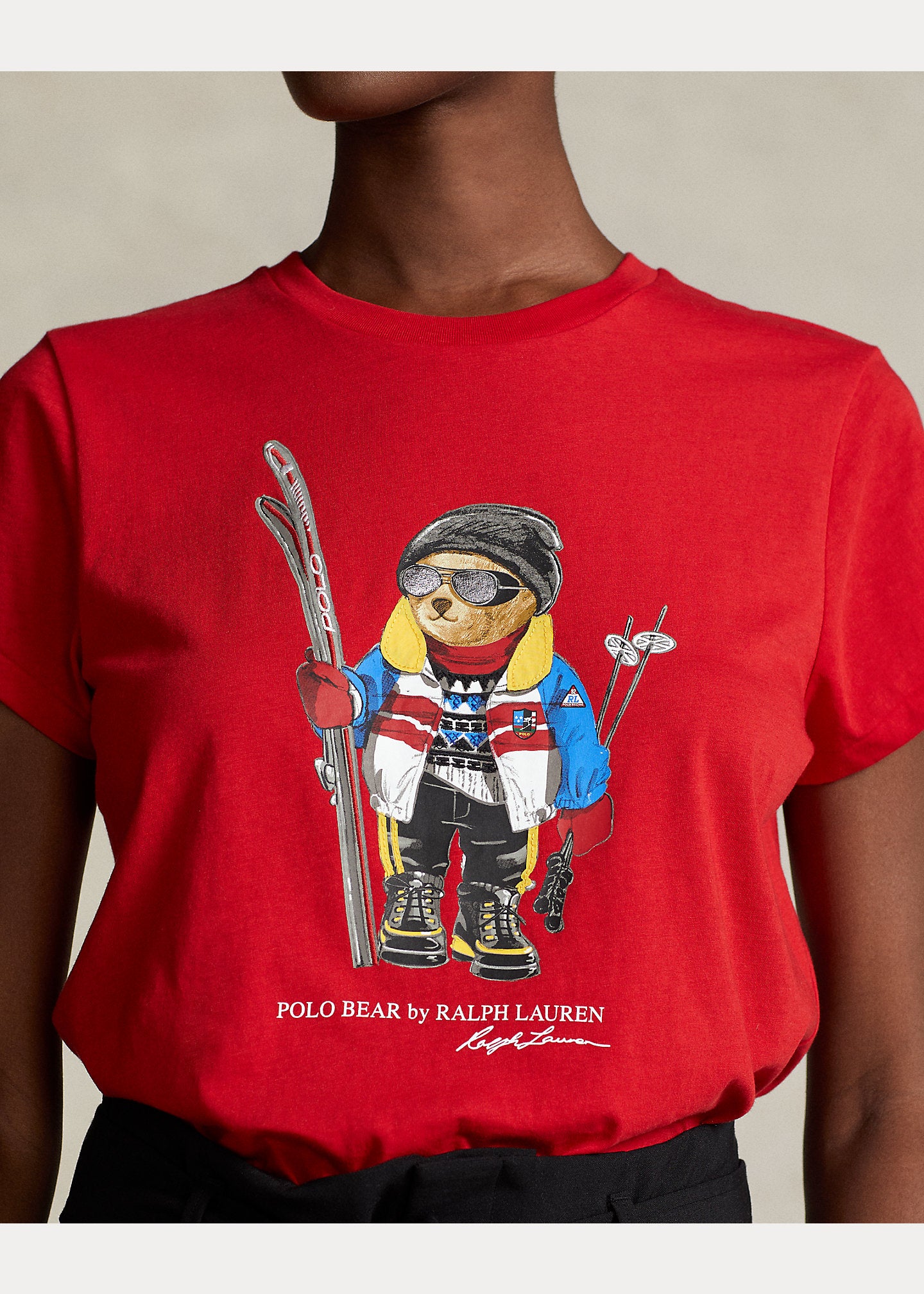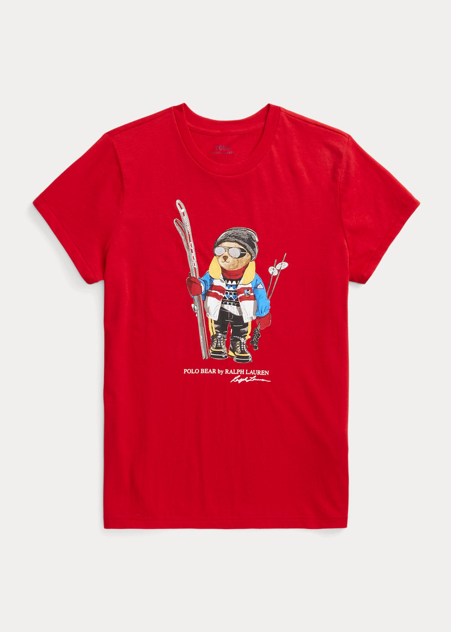 Ce t-shirt col rond en jersey de coton arbore une version imprimée et brodée de notre Polo Bear adoré, prêt à dévaler les pistes de ski vêtu d'une veste en color-block, d'un pull à motif géométrique et de lunettes de soleil.
