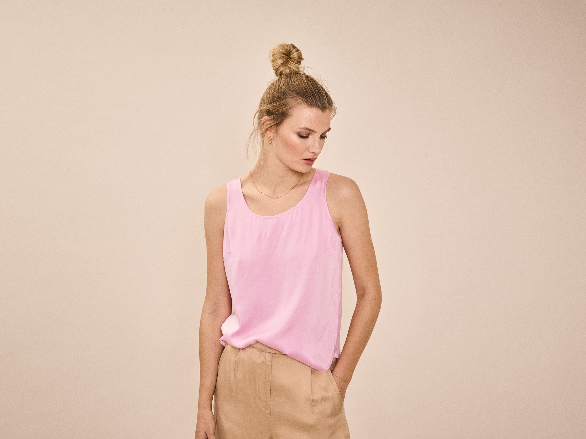 Ce magnifique haut en soie fluide est à la fois chic et féminin, avec une légère touche sportive grâce à sa forme décontractée et ses larges bretelles. La soie flotte comme de l'eau et met en valeur la couleur riche et profonde. Portez-le comme une pièce brillante et luxueuse avec un tailleur.