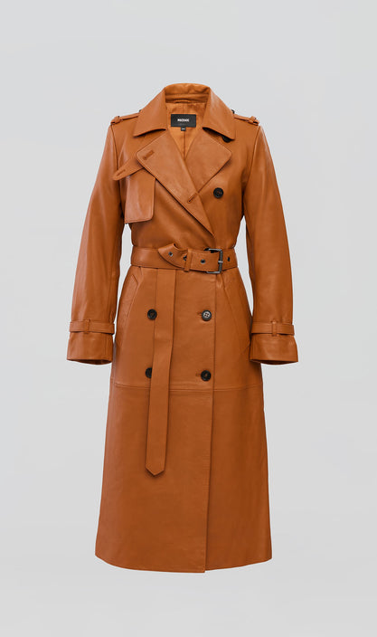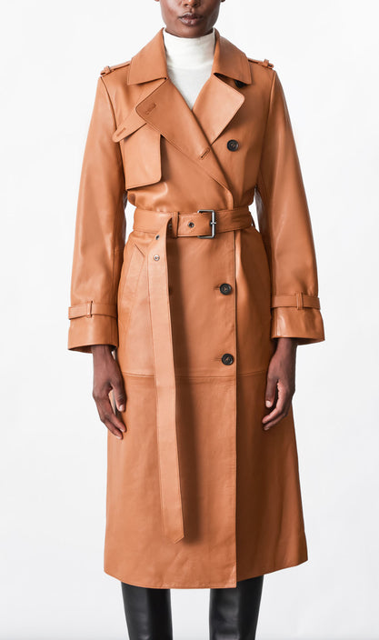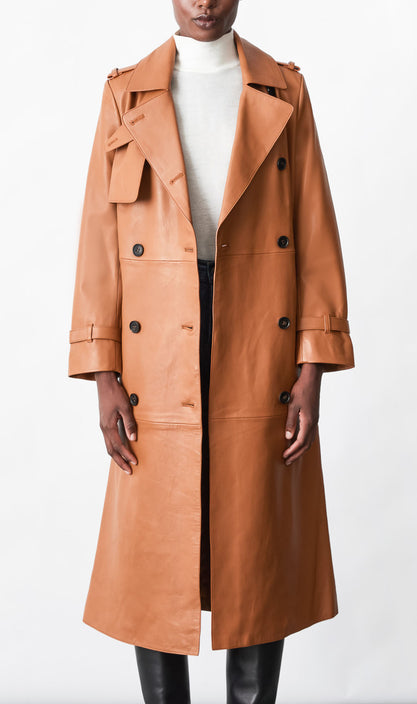 GAEL est un trench-coat à double boutonnage confectionné en cuir de mouton ultra doux. Le large revers Napoléon à encoche, la fermeture de col à boutons et la bordure asymétrique apportent des lignes sûres. La longue silhouette décontractée est structurée par une ceinture à rouleau amovible et des poignets à lanières réglables. Les poches passepoilées à la taille, les épaulettes aux épaules et les bords peints témoignent d'une confection soignée. Une pièce intemporelle au style remarquable, parfaite pour être superposée tout au long de l'année.