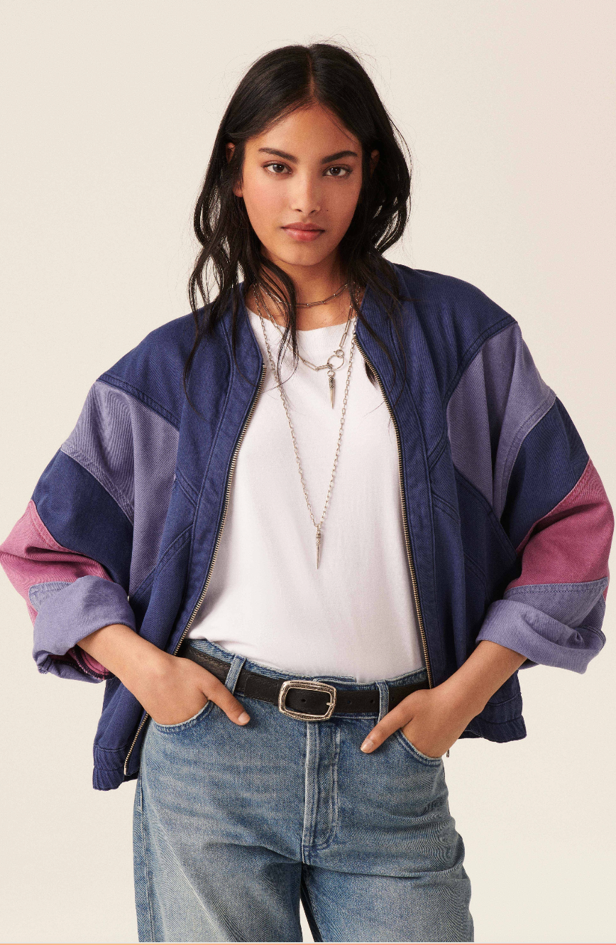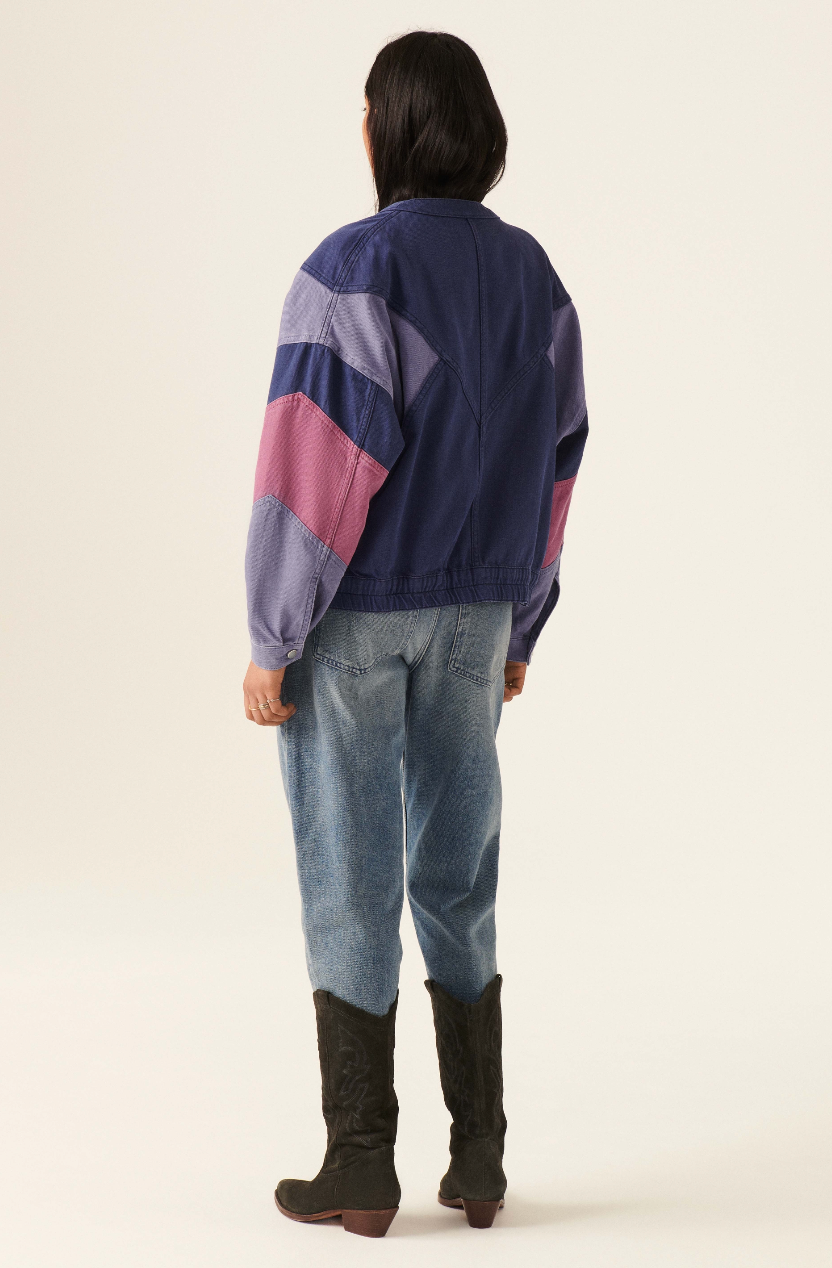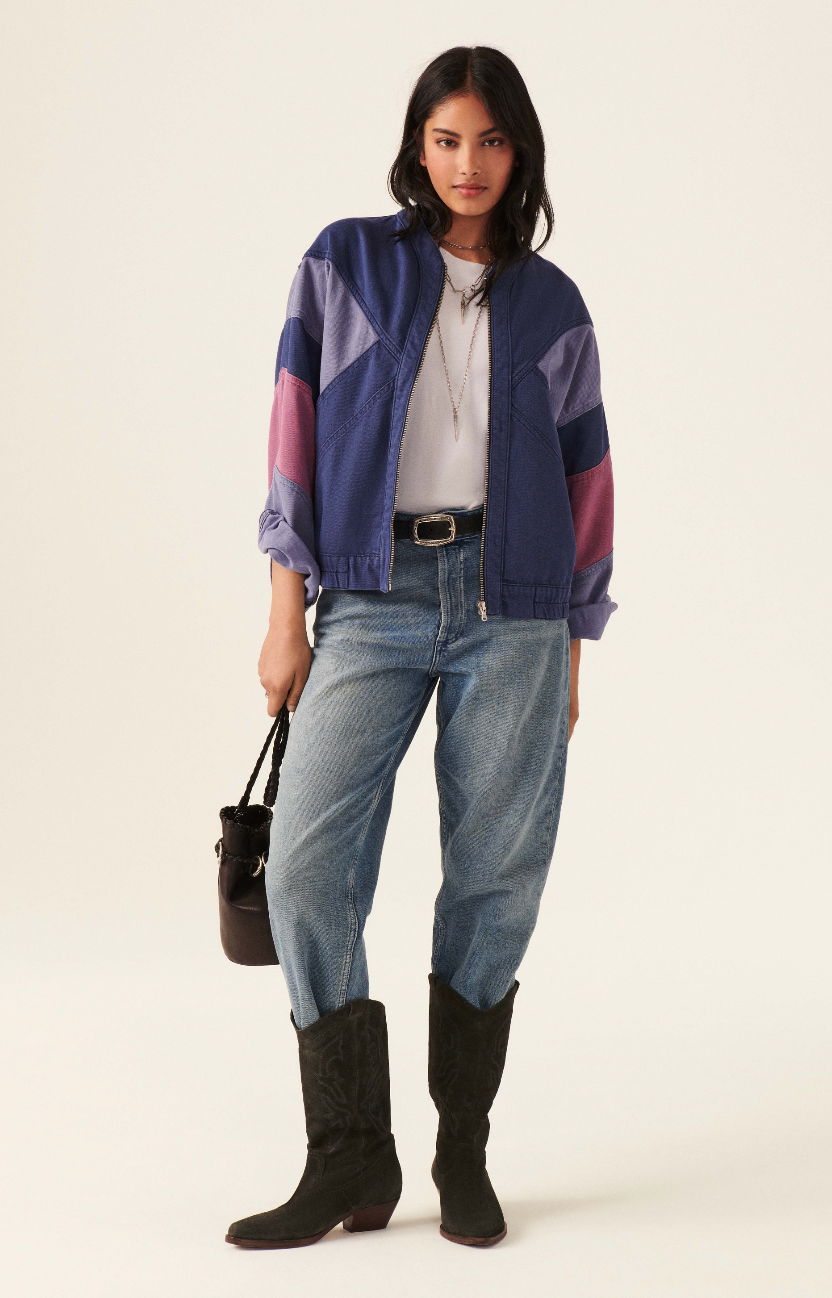 Le blouson ILY est en 100% coton et donc très confortable. Manches longues, patches de trois couleurs différentes, bleu, lavande et rose, les manches se terminent par des poignets à boutons. Le bas du corps est élastiqué pour marquer la taille. Volume loose et emmanchures basses, son inspiration 80's est totalement assumée, quel délice ! On adore son zip argenté vieilli qui donne un style vintage à la pièce. A porter avec un jean délavé taille haute pour un look irrésistible !