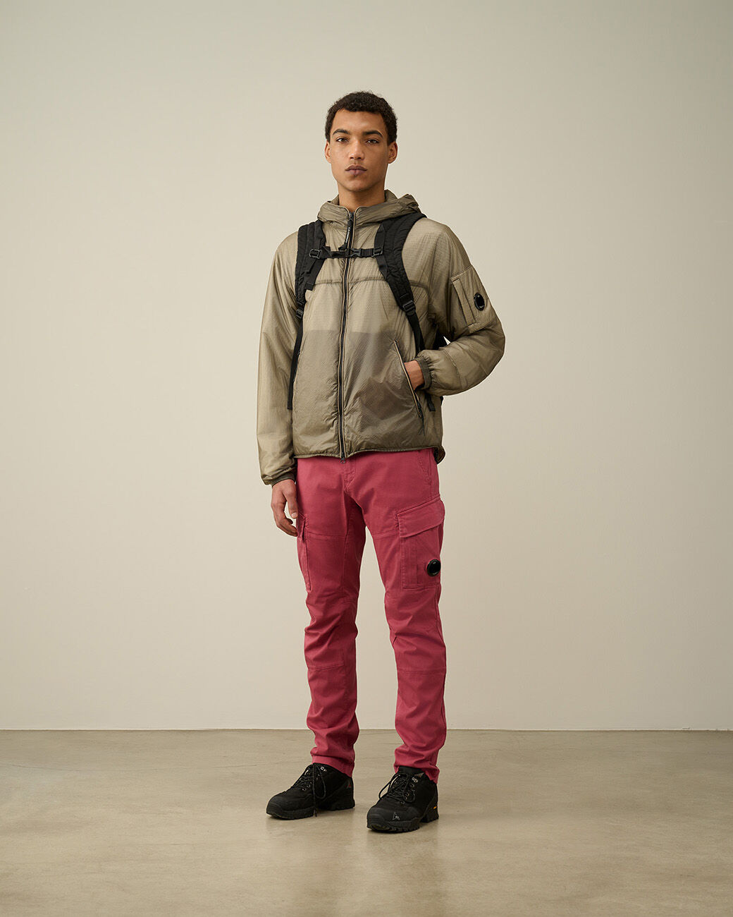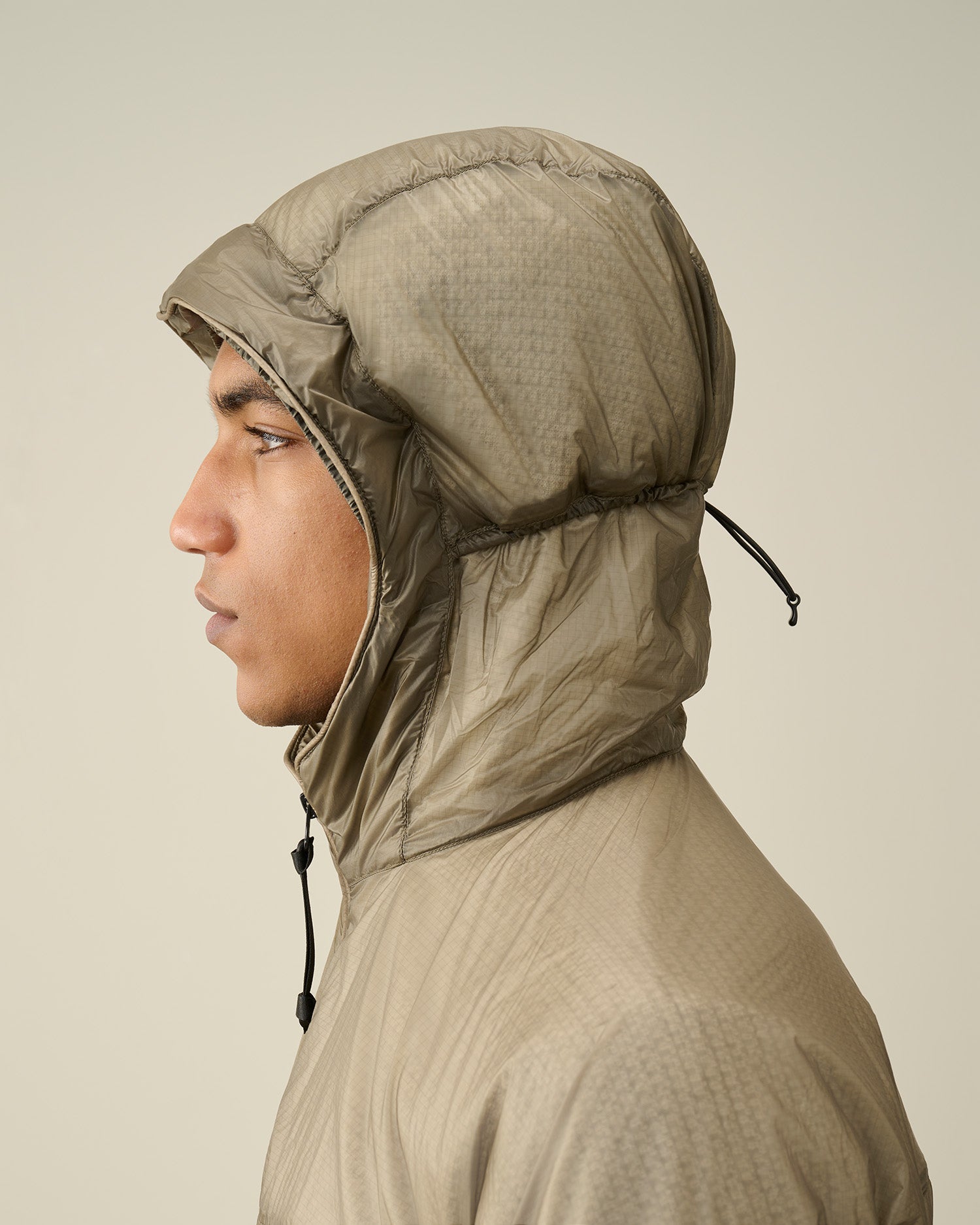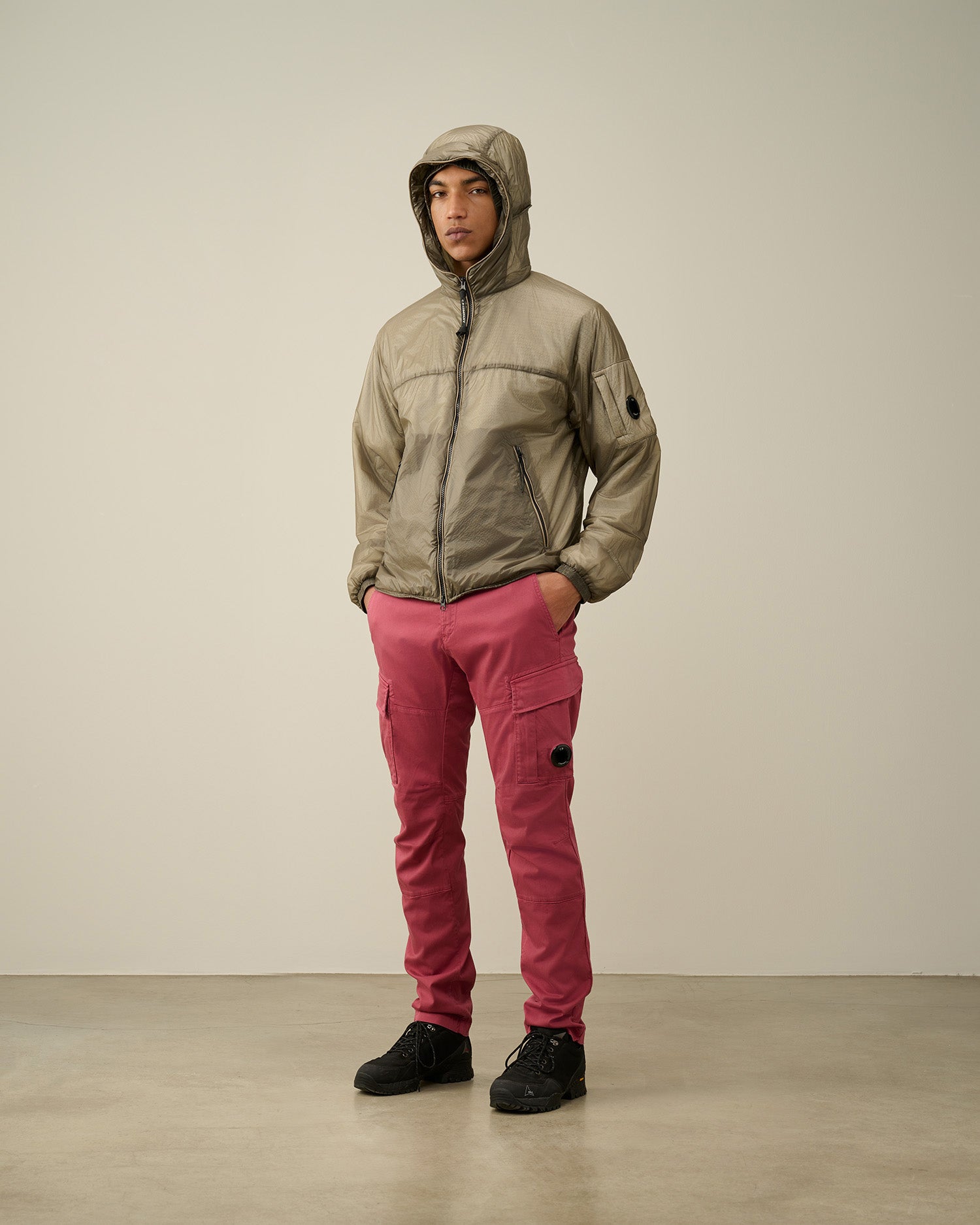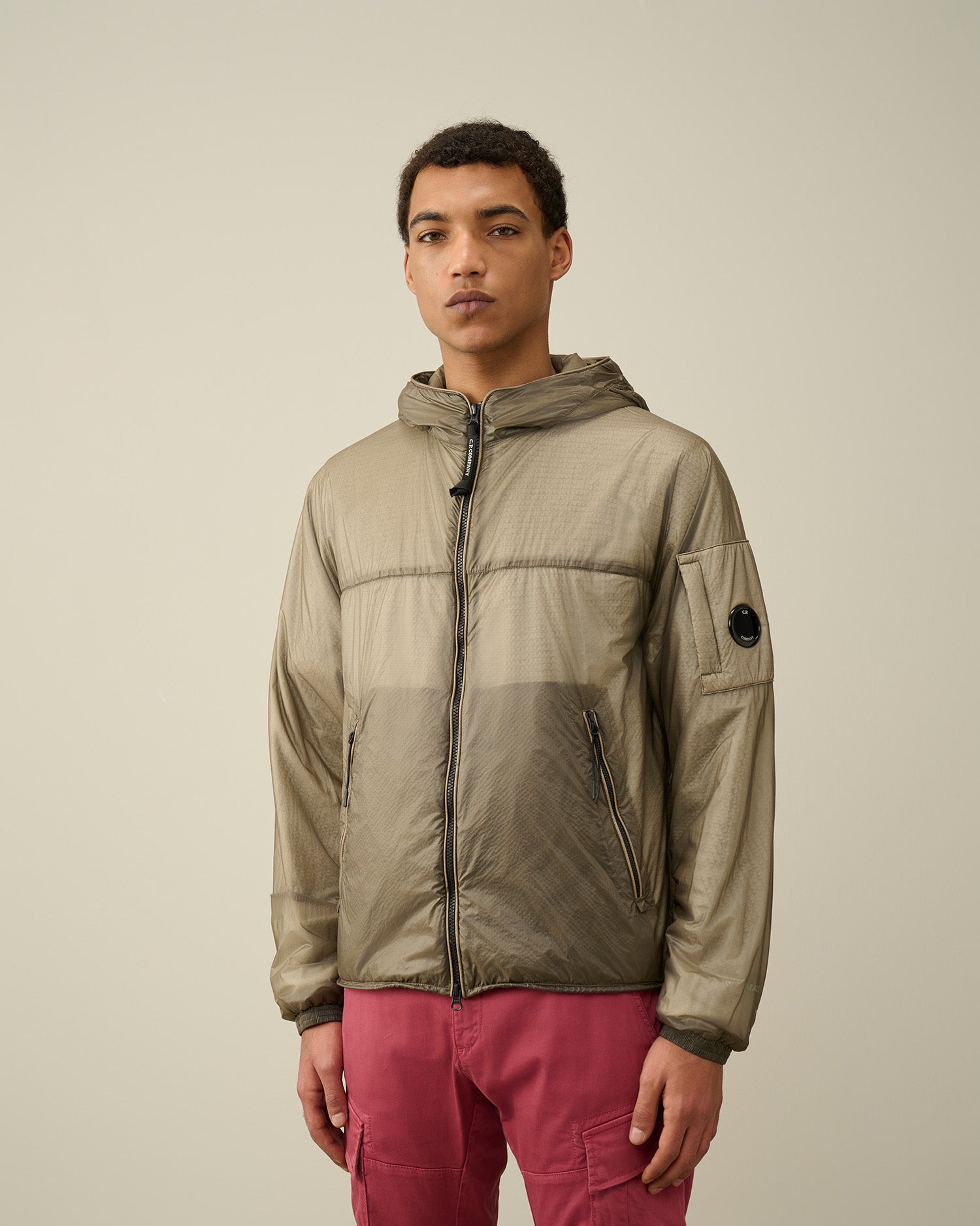 Veste courte à capuche réglable et fermeture zippée tout du long. Une poche sur la manche portant le détail en forme de verre de lunette C.P. Company, deux poches avant en biais et un ourlet réglable complètent cette veste. Modèle confectionné en Nada Shell, un tissu indéchirable ultra-léger 7 deniers avec rembourrage Primaloft. Coupe droite.