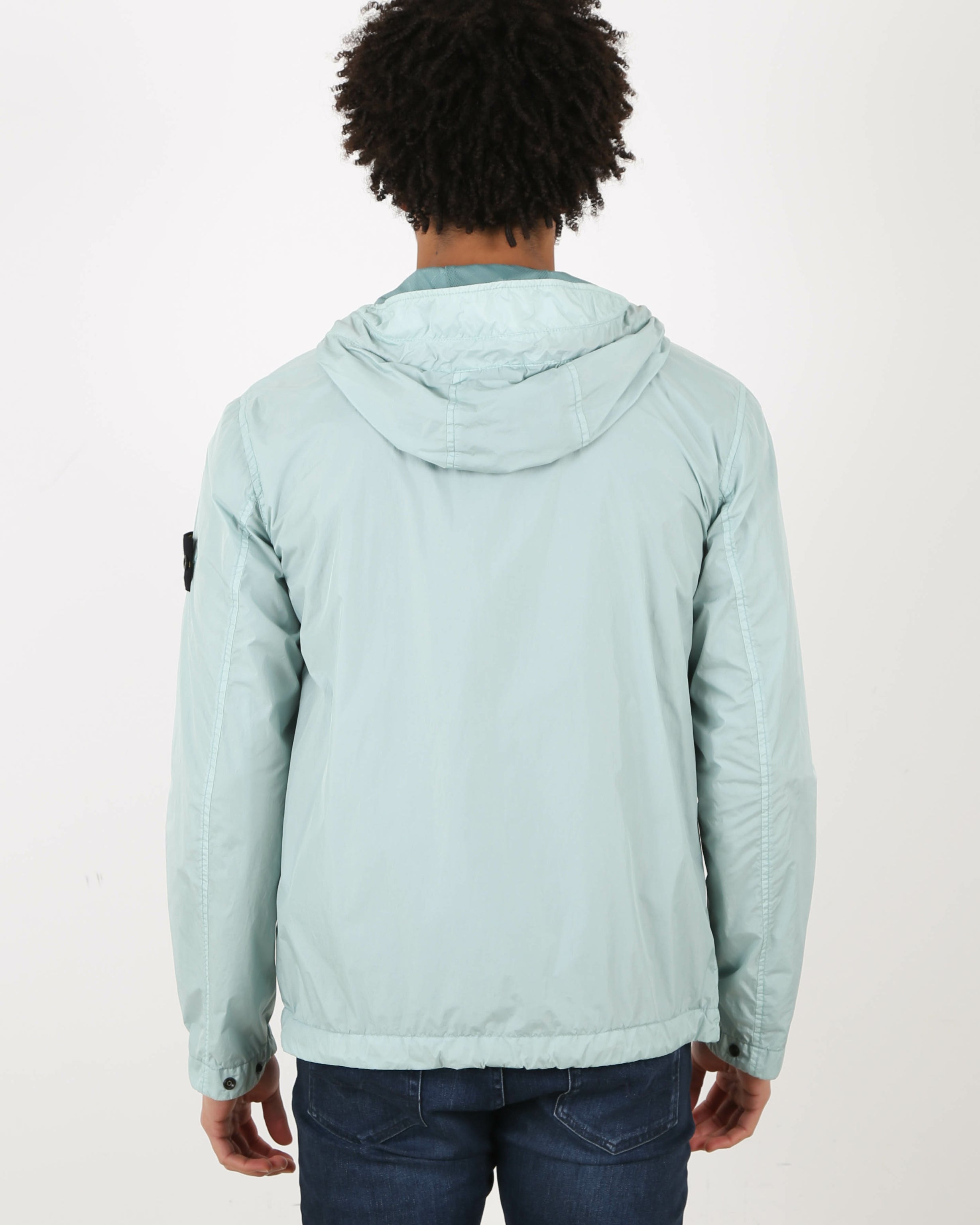 Veste de la marque Stone Island de couleur Mint Green v0041. La veste à capuche est dotée de poches pour les mains zippées, d'une fermeture éclair à double sens et d'un ourlet à cordon élastique. Grâce à un traitement spécial, la veste légère a un aspect brillant.