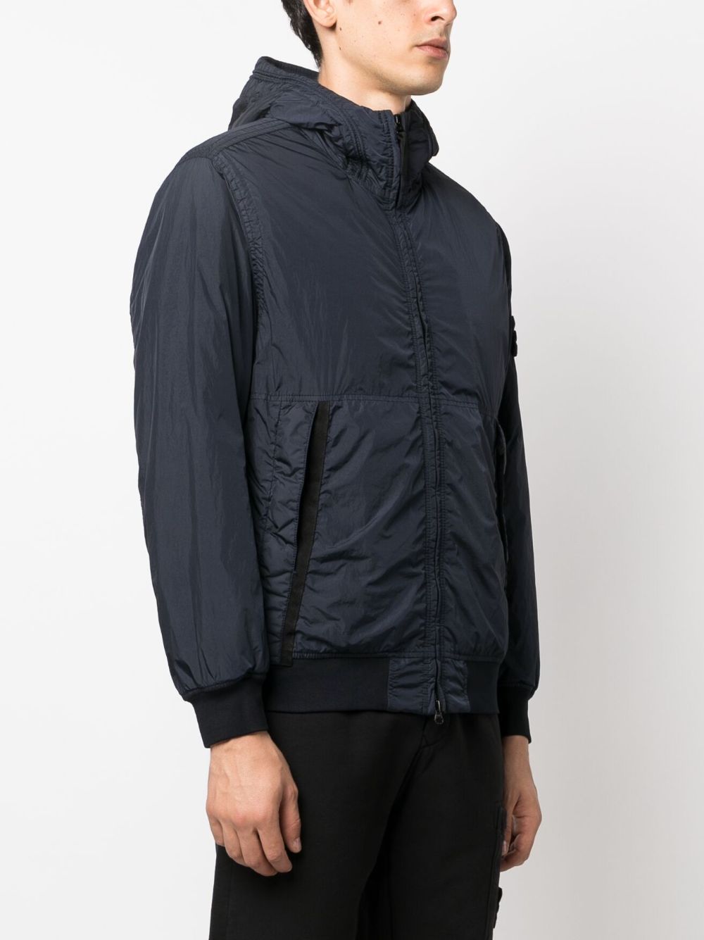 Capuche bordée de passepoils parallèles recouverts. Poches obliques avec fermeture zippée dissimulée sur ruban en nylon à chevrons. Badge Stone Island sur la manche gauche. Poignets et ourlet côtelés. Fermeture zippée à double curseur.