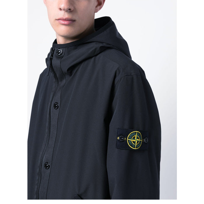 Capuche bordée de ruban. Deux poches plaquées arrondies avec fermeture zippée dissimulée. Badge Stone Island sur la manche gauche. Poignets finement côtelés. Finition sur l’ourlet inférieur. Fermeture zippée à double curseur bordée d’un ruban en nylon. Un côté fermé par boutons-pression.