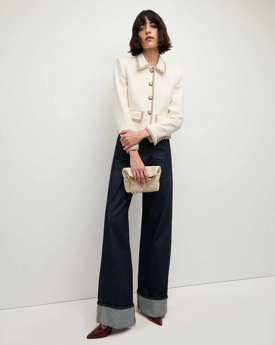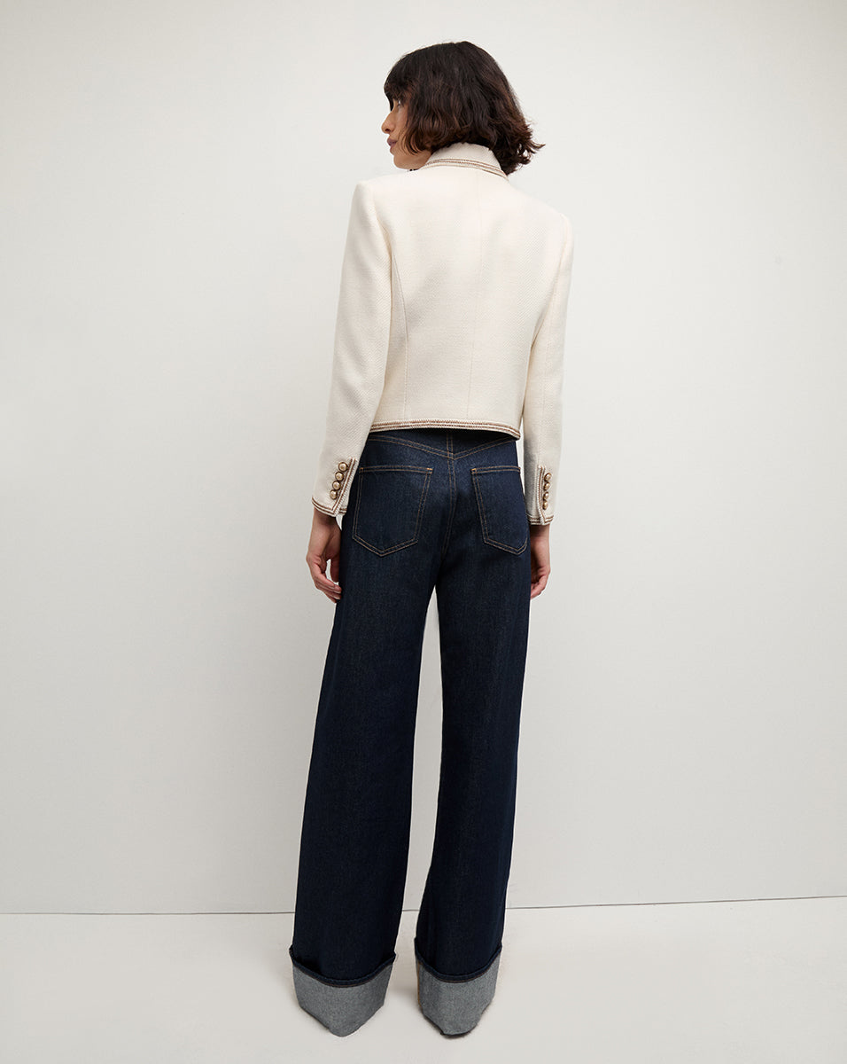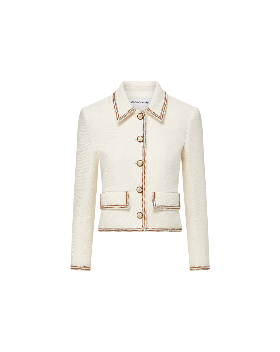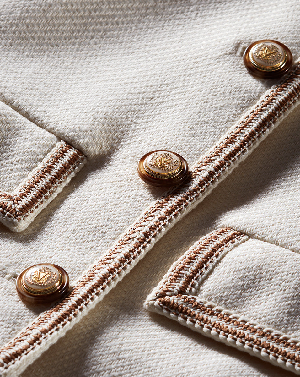 Confectionnée avec soin à partir d'un mélange de coton léger, la veste Makayla présente une silhouette courte et carrée ainsi qu'une bordure rayée brodée le long des bords, du col et des poches à rabat. Une veste chic pour femme qui se marie aussi bien avec un jean qu'avec une minijupe.