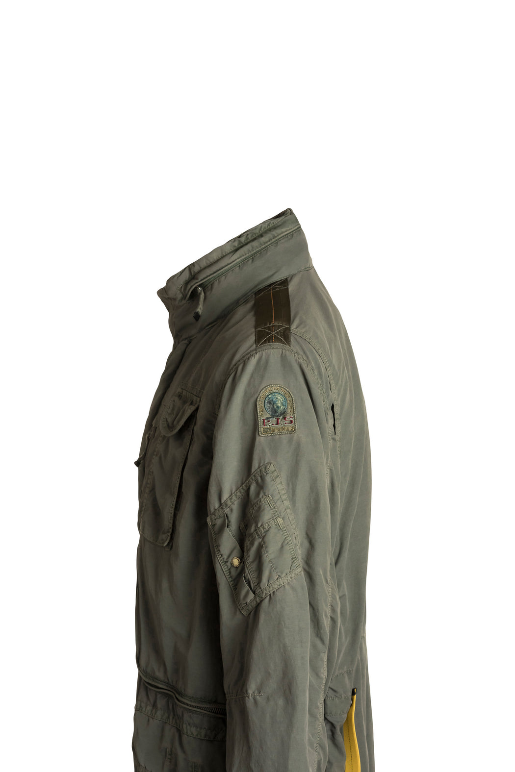 Field jacket slim. Le tissu est en micro ottoman en nylon avec une finition mate, soumis à un double bain de teinture et un traitement déperlant. La veste est teinte en pièce. Capuche avec un cordon de serrage escamotable. Cinq poches externes, une poche filet à l'intérieur et une grande poche cargo contenant une poche filet. Cordon de serrage réglable à la taille. Fermeture éclair double curseur et rabat coupe-vent avec des boutons. Aération aux aisselles et détails PJS iconiques comme le ruban élastique jaune et le patch sur la manche gauche.